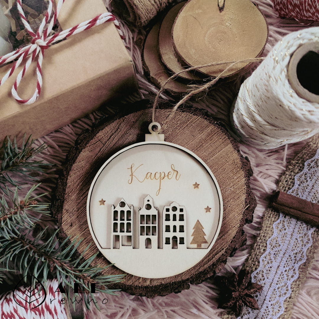 Wybierz drewnianą bombkę Kamieniczki i wprowadź do swojego domu wyjątkowy, świąteczny klimat – idealna także na prezent bożonarodzeniowy.