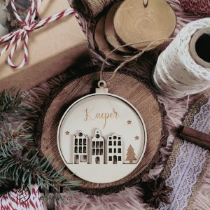 Drewniana bombka świąteczna Kamieniczki to wyjątkowa ozdoba bożonarodzeniowa inspirowana zimową zabudową miasteczek, idealna na choinkę i świąteczne dekoracje.