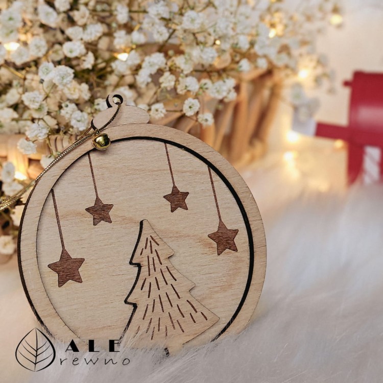 Drewniana bombka świąteczna choinka z gwiazdkami