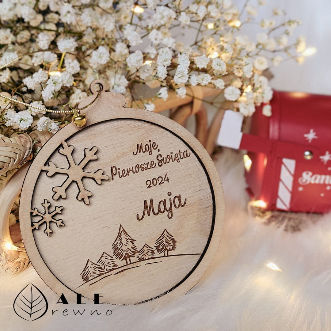 Szukasz niepowtarzalnego pomysłu na świąteczny prezent? Drewniana bombka o wymiarach 9 cm x 9 cm z imieniem dziecka oraz napisem "Moje Pierwsze Święta" to idealny wybór! Wykonana z wysokiej jakości drewna brzozowego, ta ozdoba nie tylko przyciąga wzrok swoim estetycznym wyglądem, ale również tworzy wyjątkową pamiątkę na całe życie.