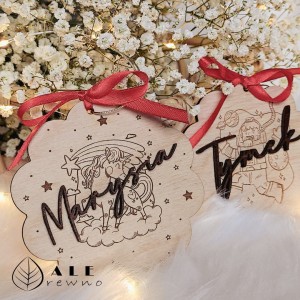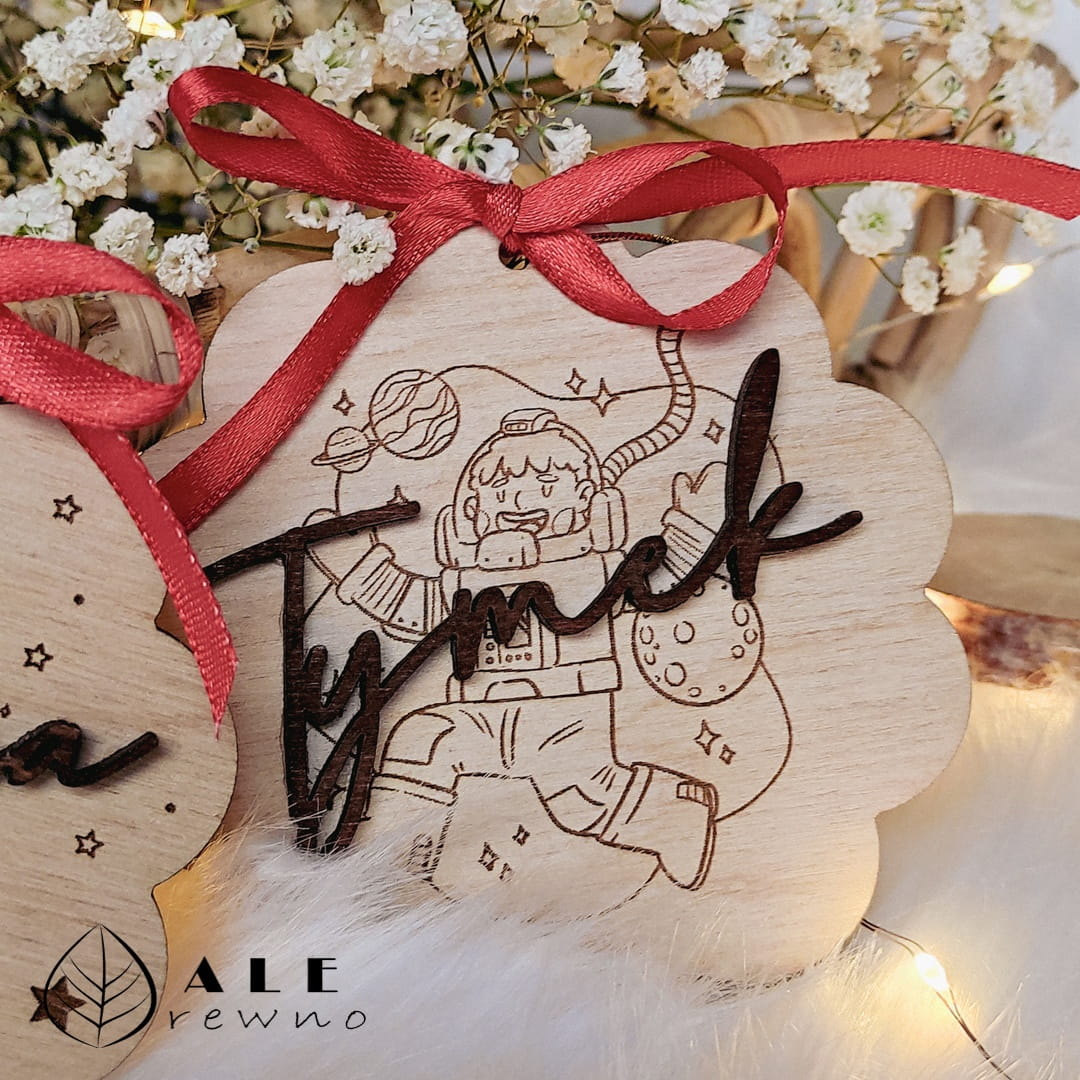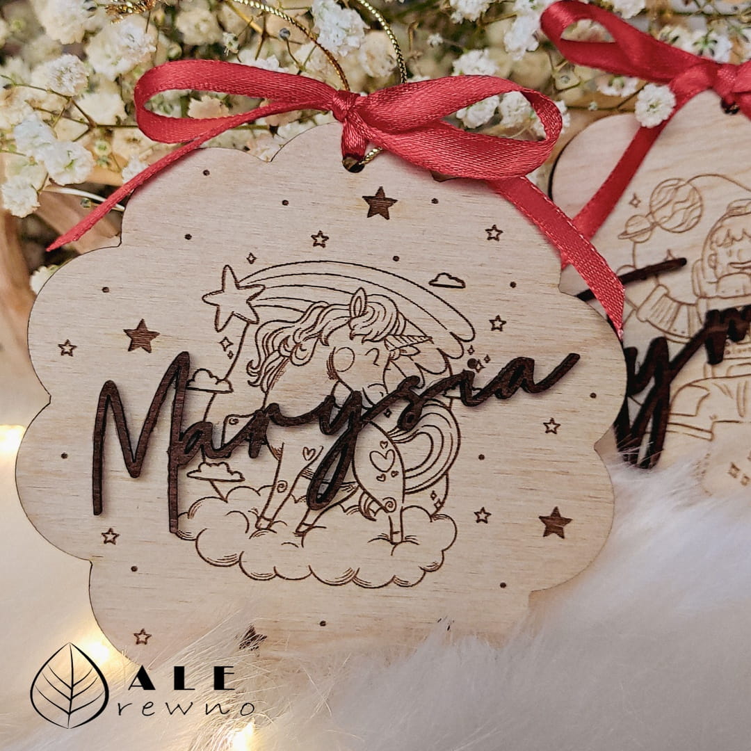 Szukasz oryginalnego pomysłu na świąteczny prezent, który zachwyci zarówno dzieci, jak i dorosłych? Drewniana bombka o wymiarach 9 cm x 9 cm z przyklejonym imieniem dziecka oraz wygrawerowaną grafiką to doskonała propozycja! Dla małego miłośnika kosmosu przygotowaliśmy wzór z astronautą, natomiast dla dziewczynki idealnym wyborem będzie bombka z uroczyą grafiką jednorożca. Wykonana z wysokiej jakości drewna brzozowego, ta ozdoba doda wyjątkowego uroku każdej choince.
