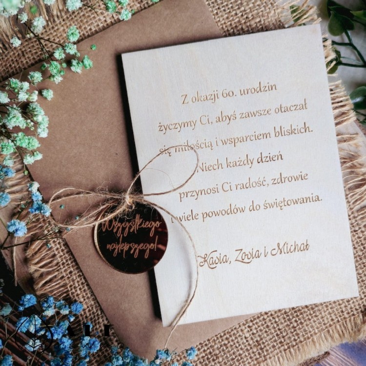 Drewniana kartka na urodziny 30, 40, 50, 60 pleksi