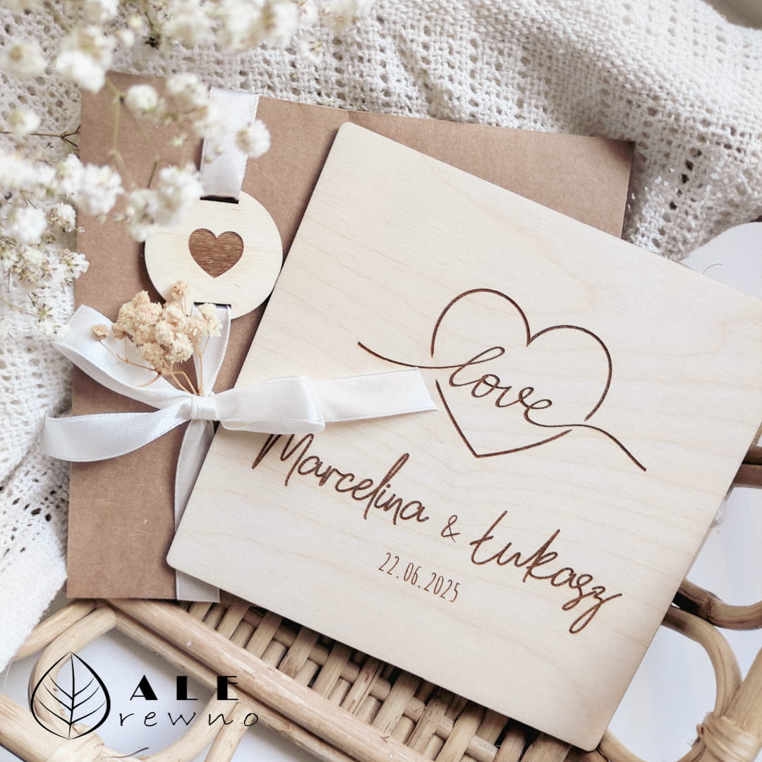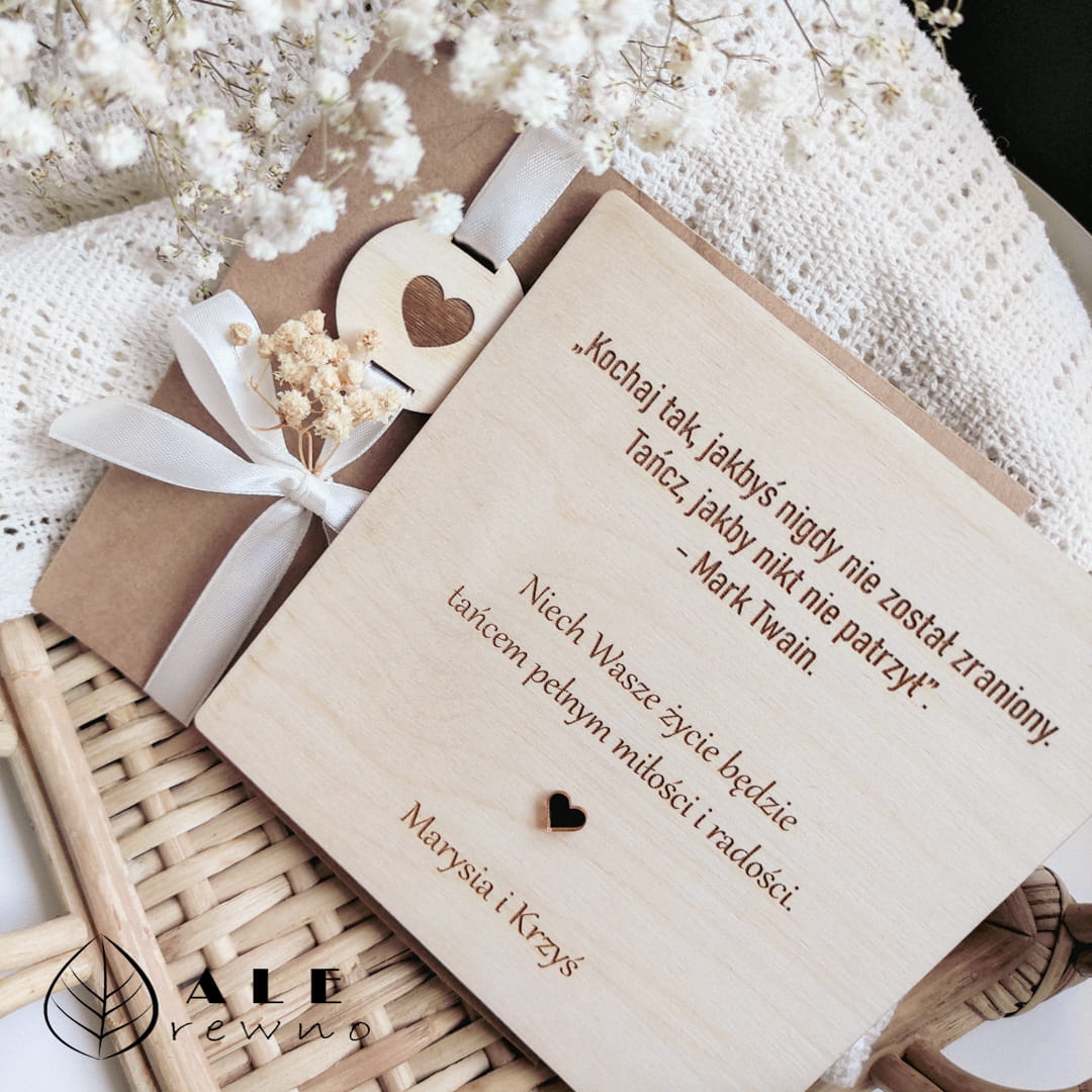 Drewniana kartka ślubna pamiątka dla Młodej Pary