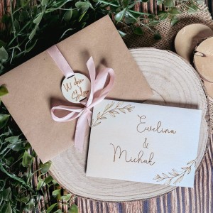 Każda kartka jest w pełni personalizowana – na froncie umieszczamy imiona Pary Młodej, a na rewersie grawerujemy wybraną przez Ciebie dedykację. Całość dopełnia wysokiej jakości koperta eco kraft oraz różowa wstążka z grawerowaną zawieszką „W dniu Ślubu”, tworząc harmonijny i gotowy do wręczenia upominek.