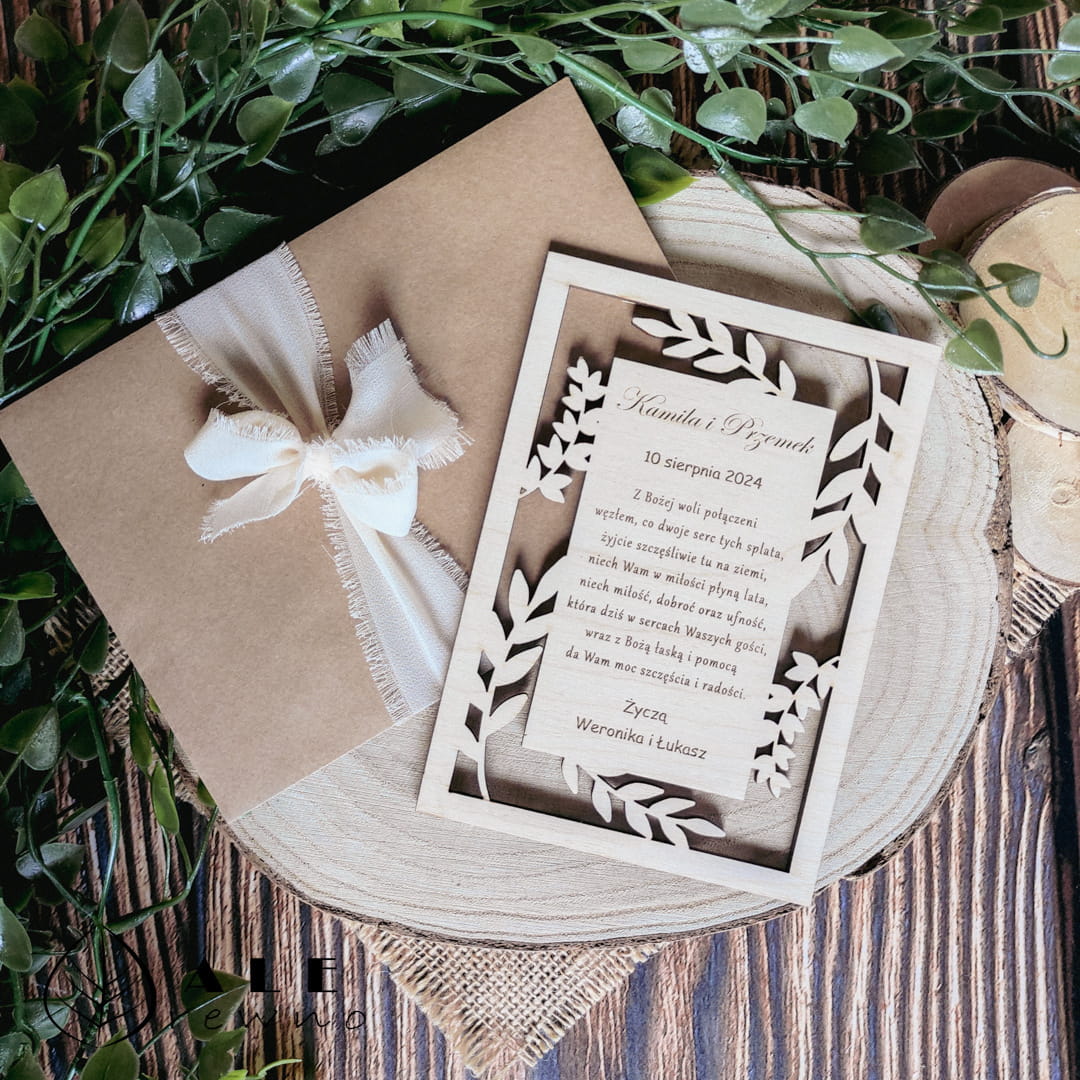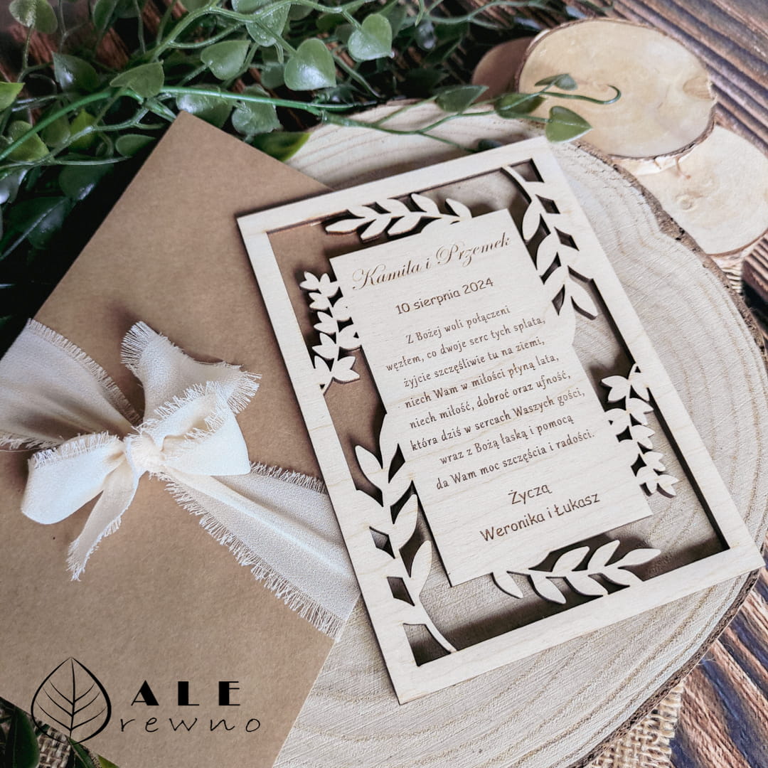 Drewniana kartka ślubna z życzeniami listki – ażurowa elegancja pełna natury