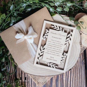 Drewniana kartka ślubna z życzeniami i motywem listków – pamiątka, która przetrwa lata. Ażurowy grawer, personalizacja i elegancka koperta w zestawie.