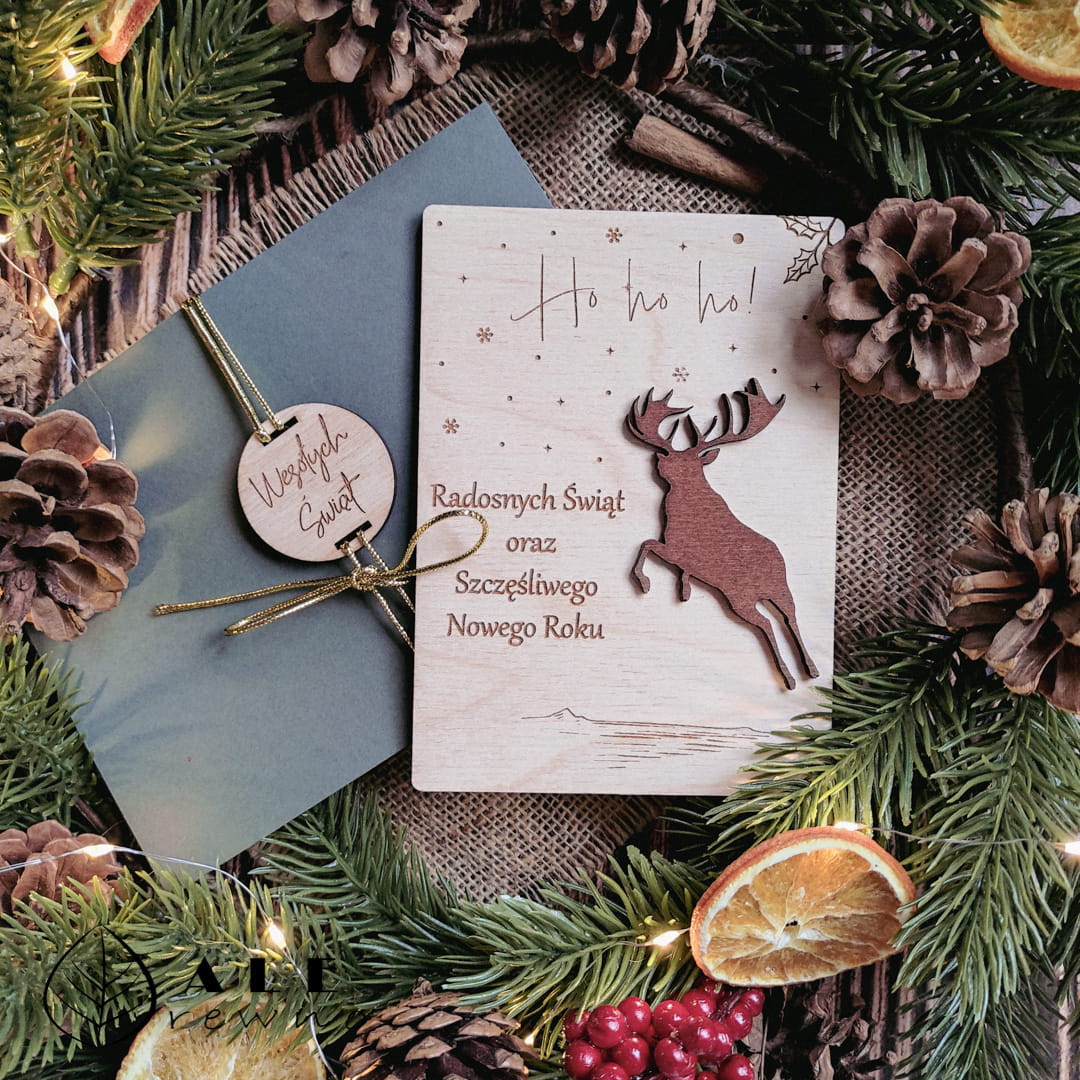Drewniana kartka świąteczna Boże Narodzenie renifer