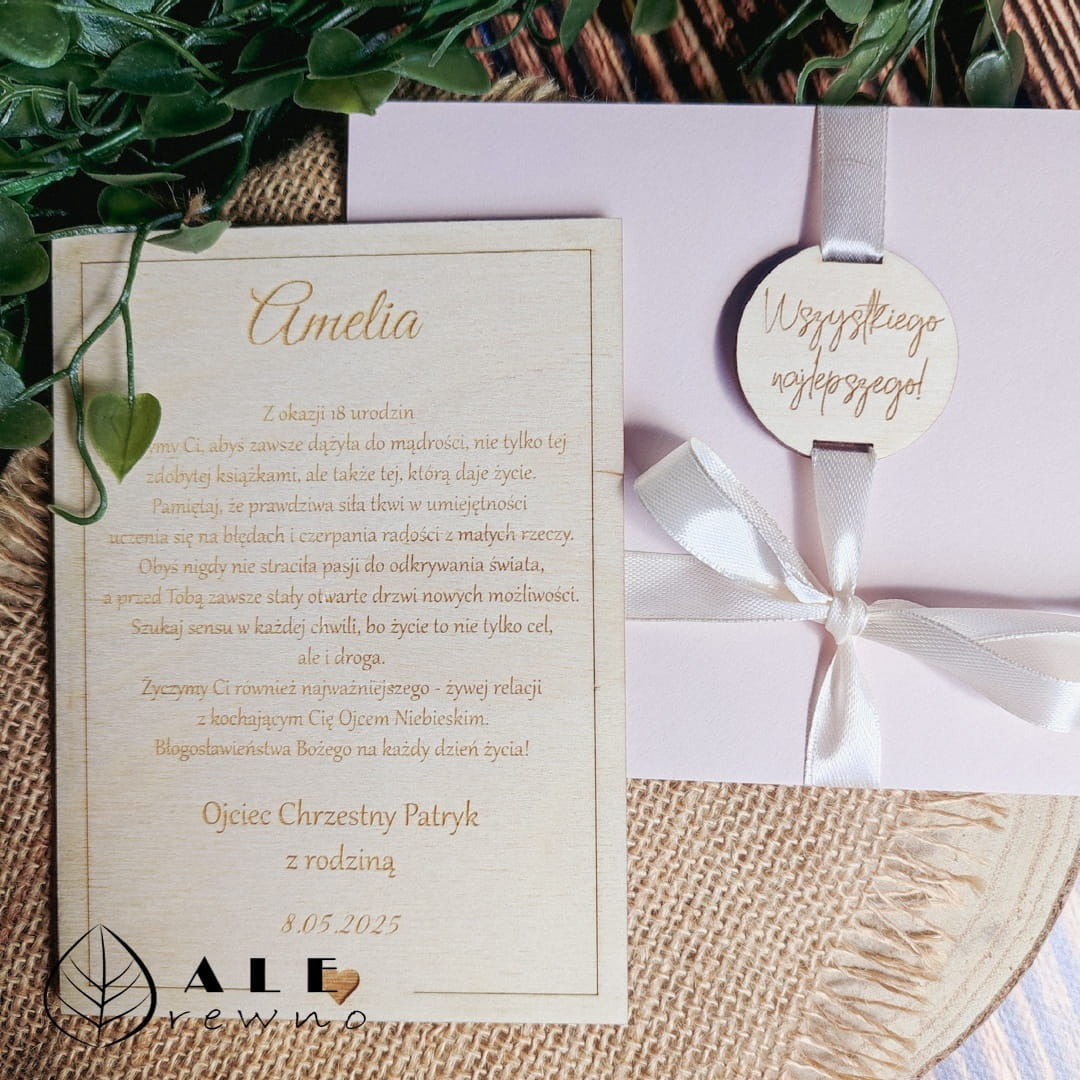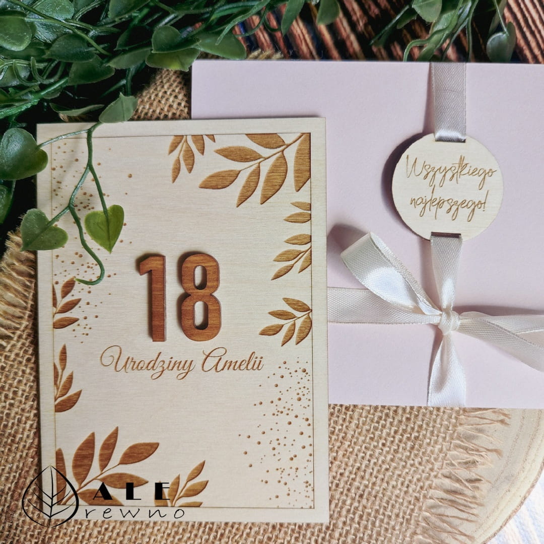 Drewniana kartka urodzinowa na 18 z personalizowanymi życzeniami