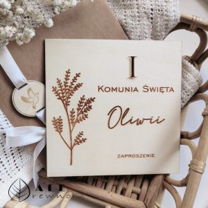 Drewniana kartka zaproszenie na Komunię Świętą – zapowiedz uroczystość z klasą