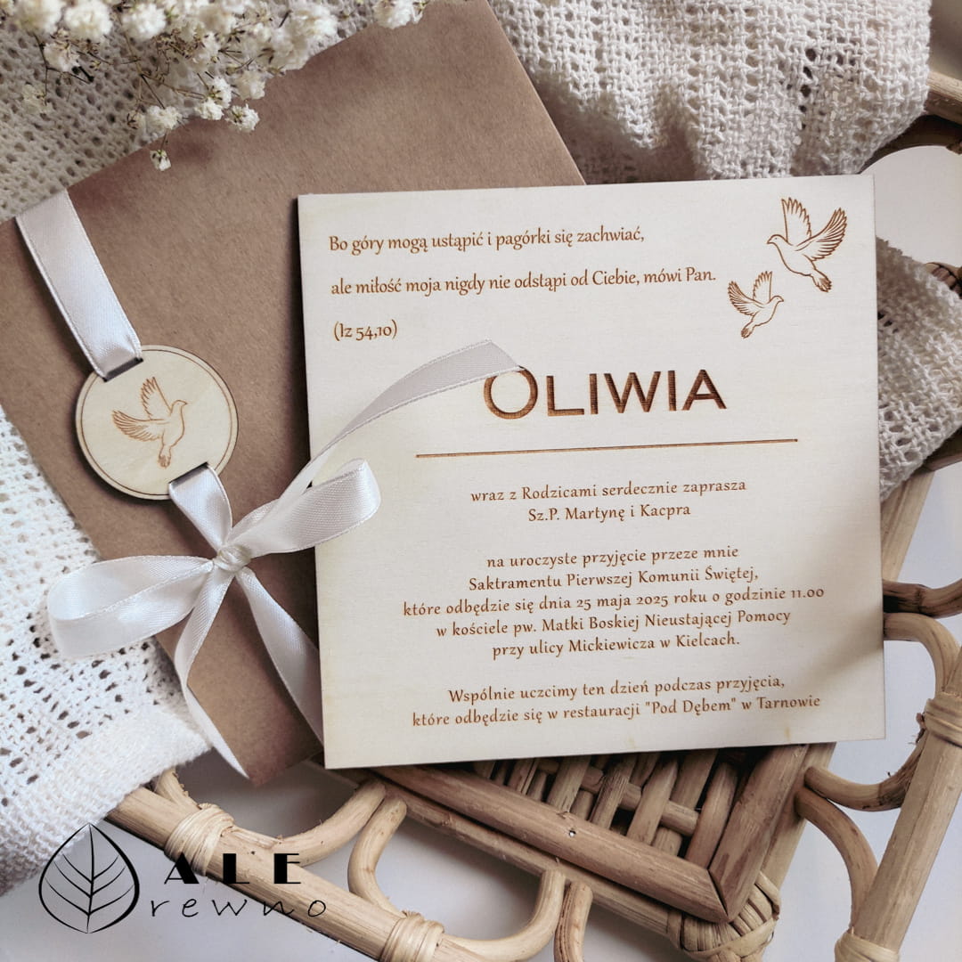 Drewniana kartka zaproszenie na Komunię Świętą – personalizowany grawer z imieniem dziecka. Ekskluzywna oprawa z kopertą i białą satynową wstążką w zestawie.