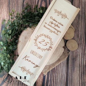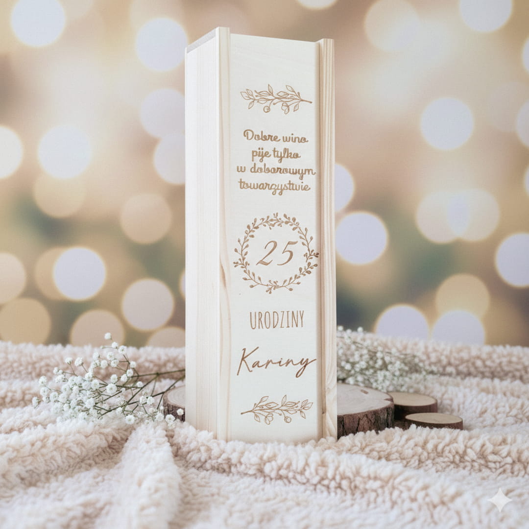 Na frontowej, przesuwnej ściance umieszczamy elegancki wieniec z wiekiem jubilata oraz dopasowane do okazji hasło, takie jak: „Dobre wino pije tylko w doborowym towarzystwie”. Dzięki personalizacji imieniem, każda skrzynka staje się przedmiotem stworzonym z myślą o tej jednej, konkretnej osobie.