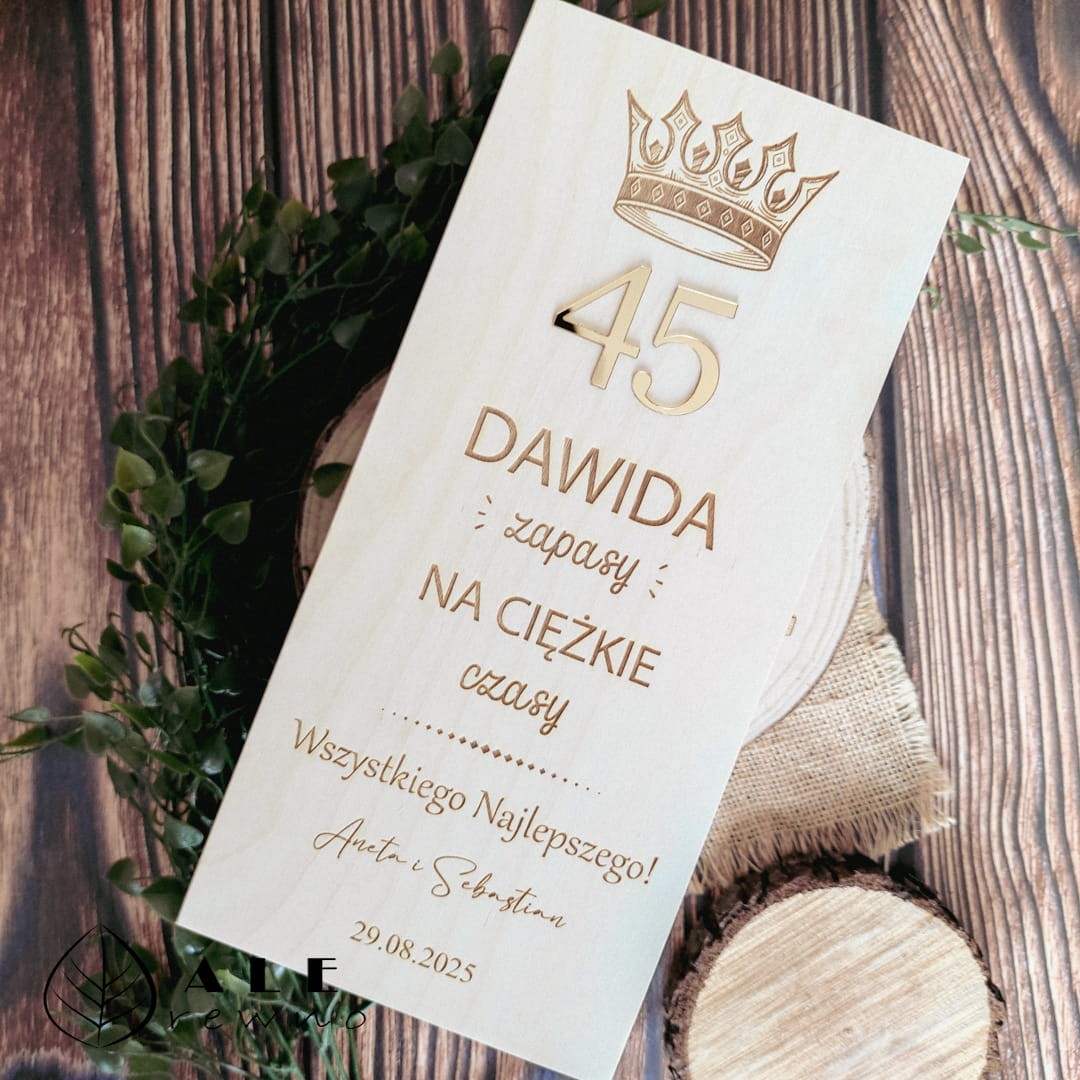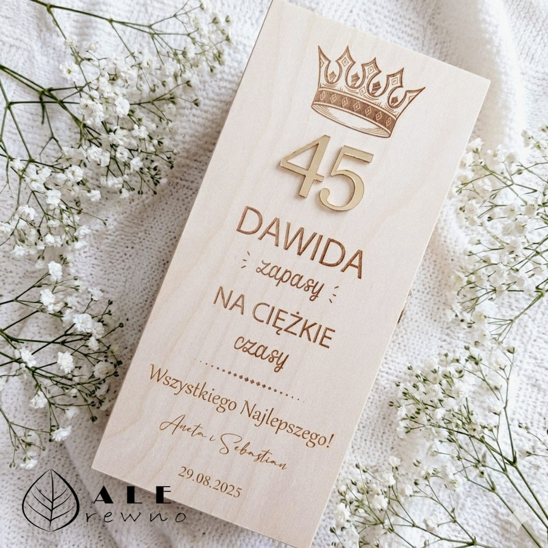 Wybierz dodatek, który wyróżni Twój prezent na tle innych. Nasze drewniane skrzynki to gwarancja zachwytu i praktyczne rozwiązanie w jednym. Podaj imię jubilata, wiek oraz datę w zamówieniu, a my przygotujemy dla Ciebie personalizowany produkt, który stanie się symbolem udanego świętowania.