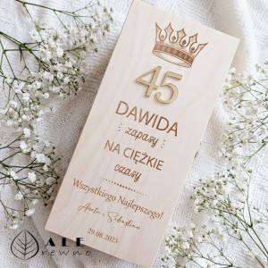 Efektowny detal 3D: Lustrzana lub drewniana liczba wieku (w przykładzie "45") jest nakładana osobno, co nadaje projektowi głębi i luksusowego wyglądu.