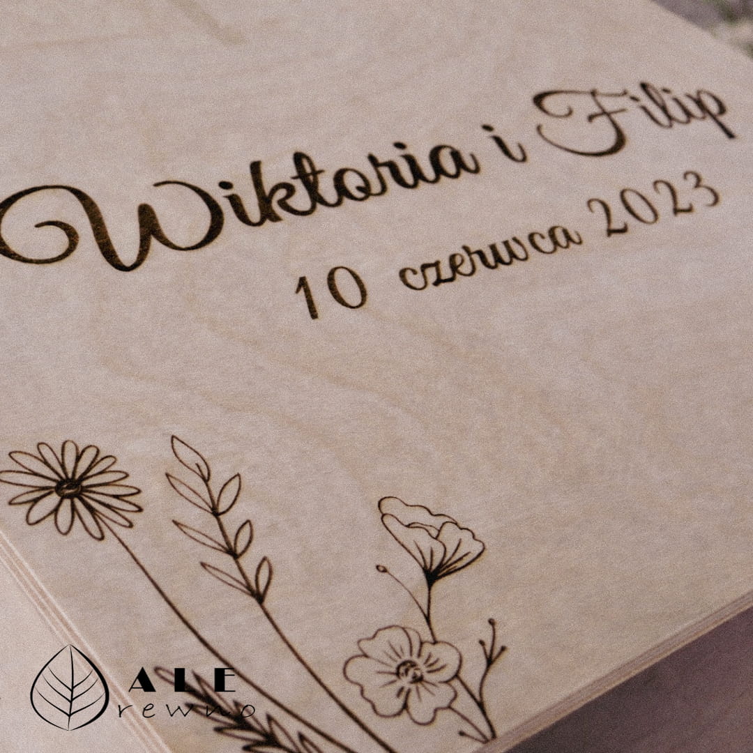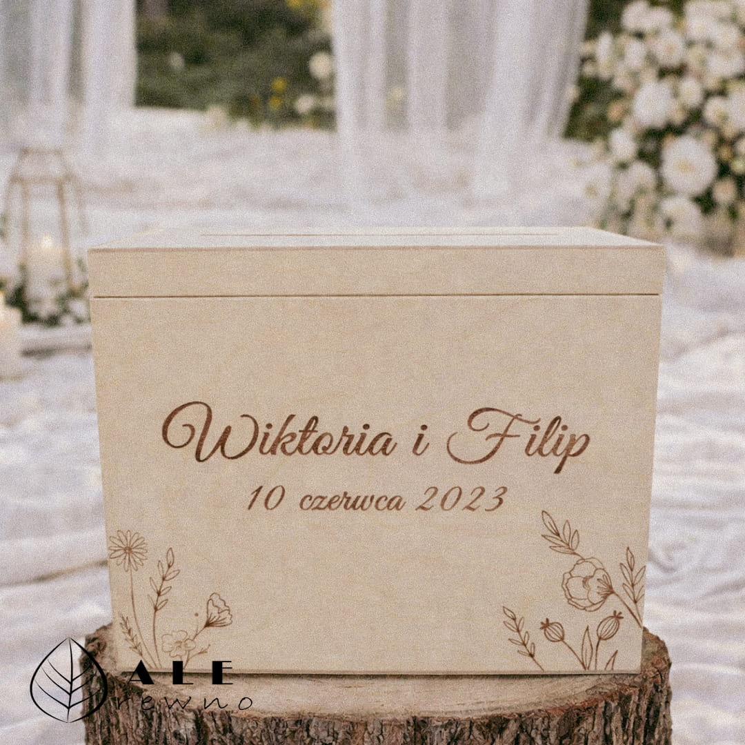 Nasza skrzynka na koperty ślubne została wykonana z wysokiej jakości naturalnego drewna, które zachwyca prostotą i ponadczasowym charakterem. Subtelny grawer nadaje jej wyjątkowego, personalnego wyglądu, dzięki czemu idealnie wpisuje się w klimat uroczystości ślubnej – zarówno klasycznej, rustykalnej, boho, jak i nowoczesnej.