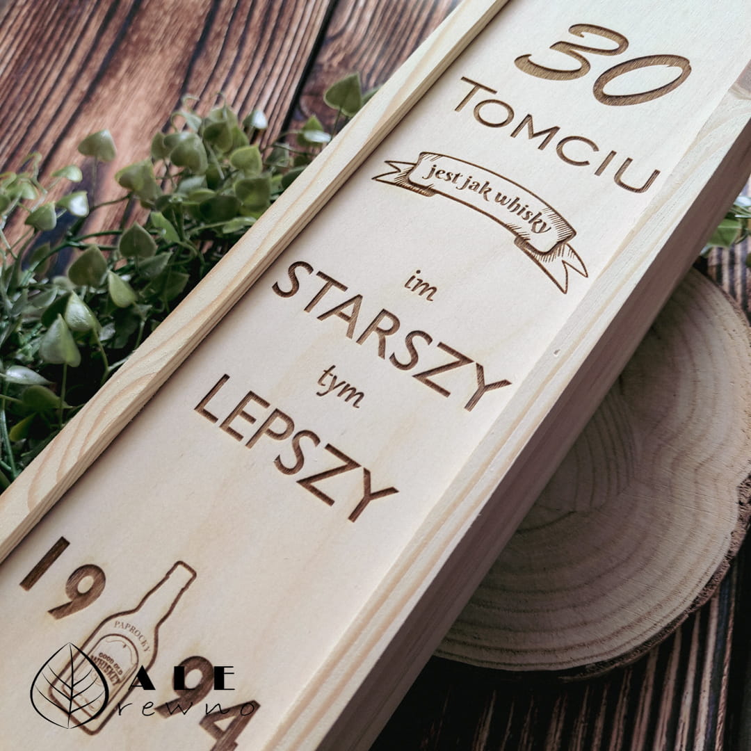 Wybór odpowiedniego trunku na urodziny to dopiero początek – prawdziwe wrażenie robi sposób jego wręczenia. Nasza drewniana skrzynka na whisky została stworzona z myślą o jubilatach, którzy cenią elegancję i unikatowość. Wykonana z naturalnego, jasnego drewna sosnowego, stanowi idealną oprawę dla butelki ulubionego Bourbonu czy Single Malt. Dzięki precyzyjnemu grawerowi laserowemu z imieniem i wiekiem, prezent staje się osobistą pamiątką, która zostanie w domu jubilata na lata, długo po opróżnieniu zawartości.