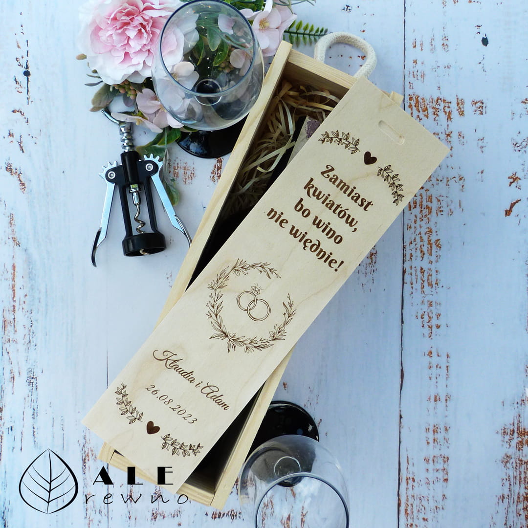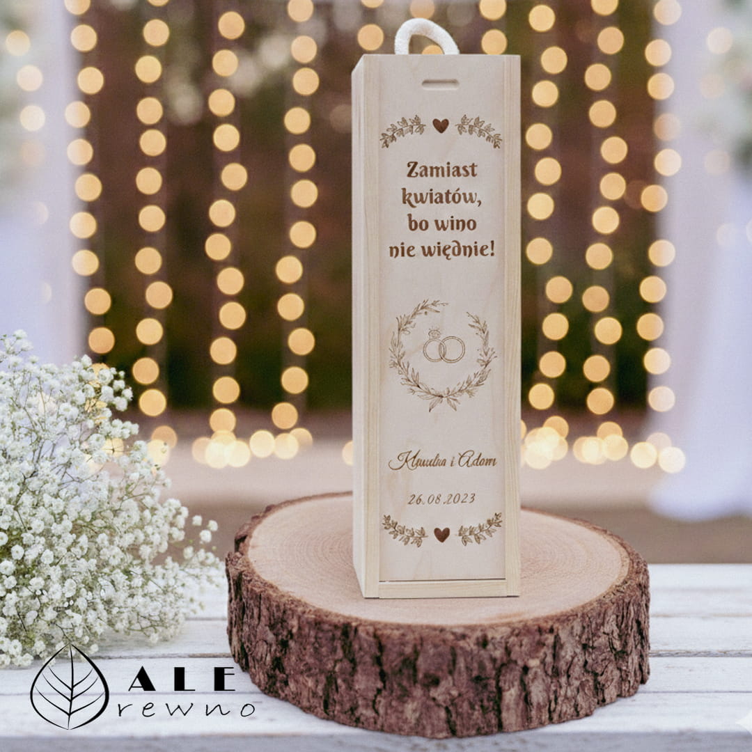 Wyjątkowa drewniana skrzynka na wino z grawerem dla Nowożeńców. Elegancki sposób na wręczenie alkoholu, który po latach pozostanie piękną pamiątką ślubną.