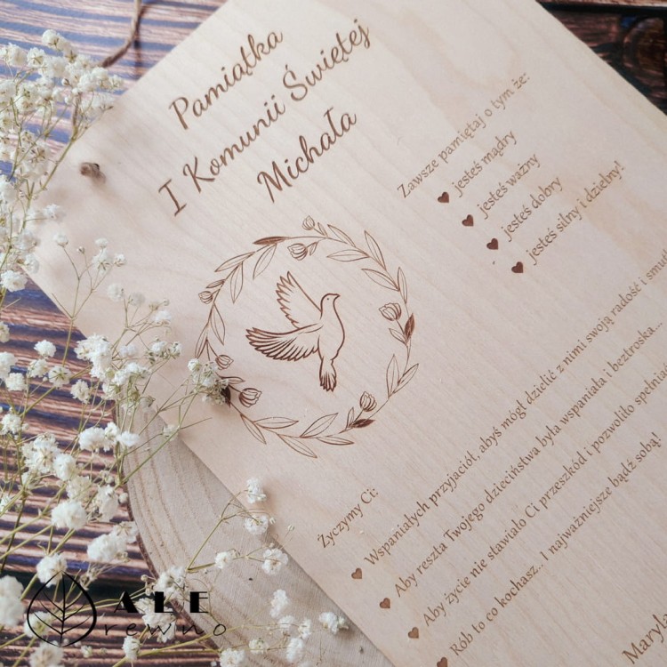Drewniana tabliczka z życzeniami na Komunię Świętą – pamiątka na całe życie