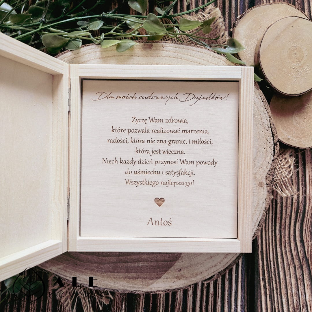 Szukasz wyjątkowego upominku dla swoich Dziadków? Nasze drewniane pudełko o wymiarach 14,5x14,5 cm, wykonane z naturalnego drewna sosnowego, to doskonały wybór! Piękna wstążka dopełnia całość, nadając całości elegancki charakter. To praktyczny i trwały prezent, który z pewnością zachwyci swoich właścicieli. W środku znajdziesz życzenia, które sprawiają, że jest to jeszcze bardziej osobisty podarunek.