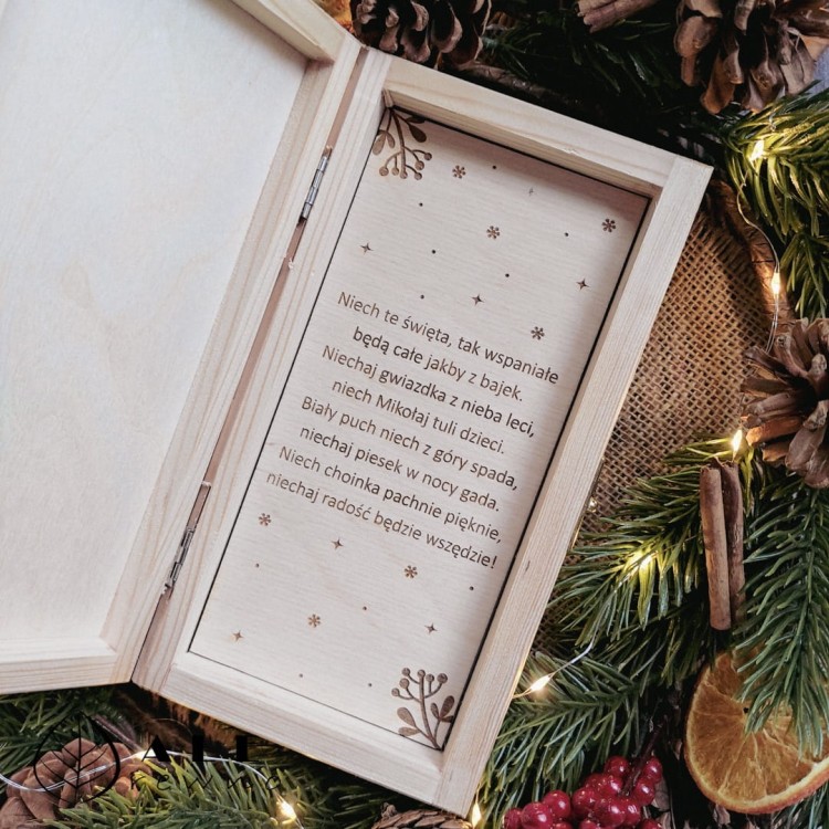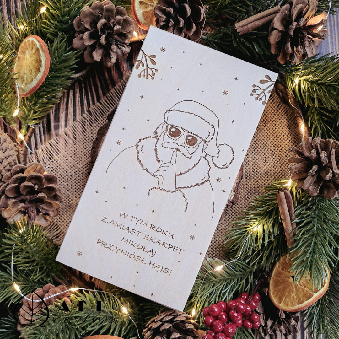 Drewniane pudełko świąteczne na pieniądze hajs od Mokołaja