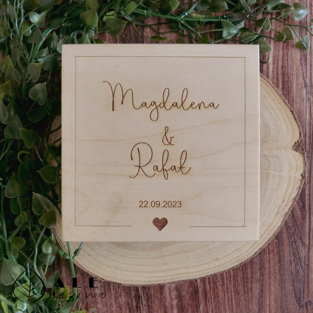 Personalizacja w postaci imion, daty ślubu lub wyjątkowego tekstu sprawia, że pudełko staje się niepowtarzalną pamiątką tego ważnego dnia.