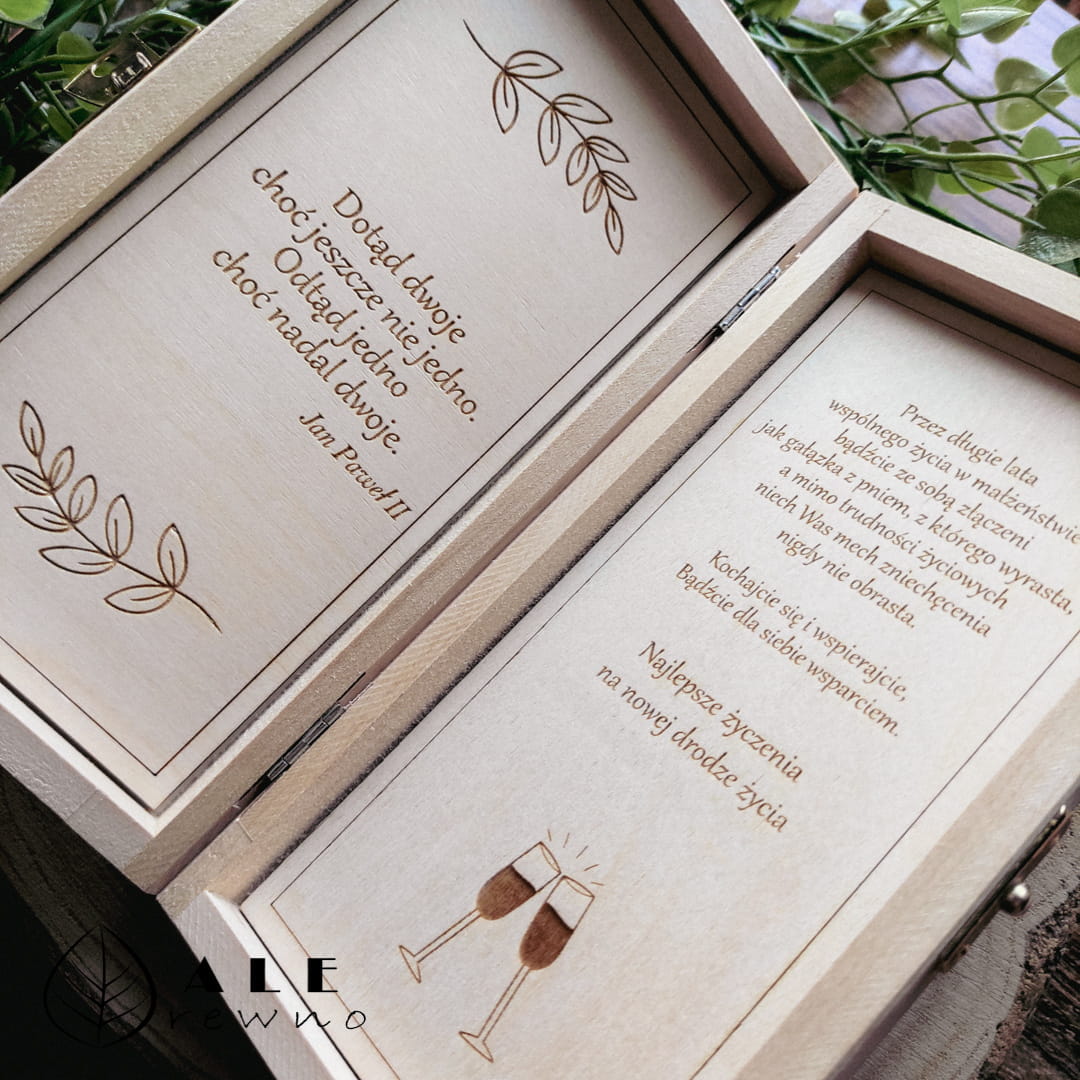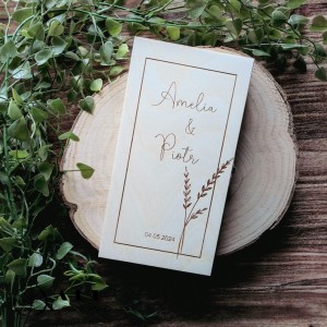 Szukasz wyjątkowego sposobu na wręczenie gotówki Nowożeńcom? Nasze drewniane pudełko z motywem kłosa to stylowa i ekologiczna alternatywa dla tradycyjnej papierowej koperty. Wykonane z jasnego drewna, ozdobione precyzyjnym grawerem imion Pary Młodej oraz daty uroczystości, stanowi nie tylko opakowanie prezentu, ale przede wszystkim piękną pamiątkę, która zostanie z małżonkami na lata. Delikatna grafika kłosów nadaje całości rustykalnego i szlachetnego charakteru, idealnie wpisując się w najnowsze trendy ślubne.