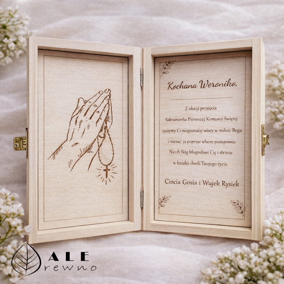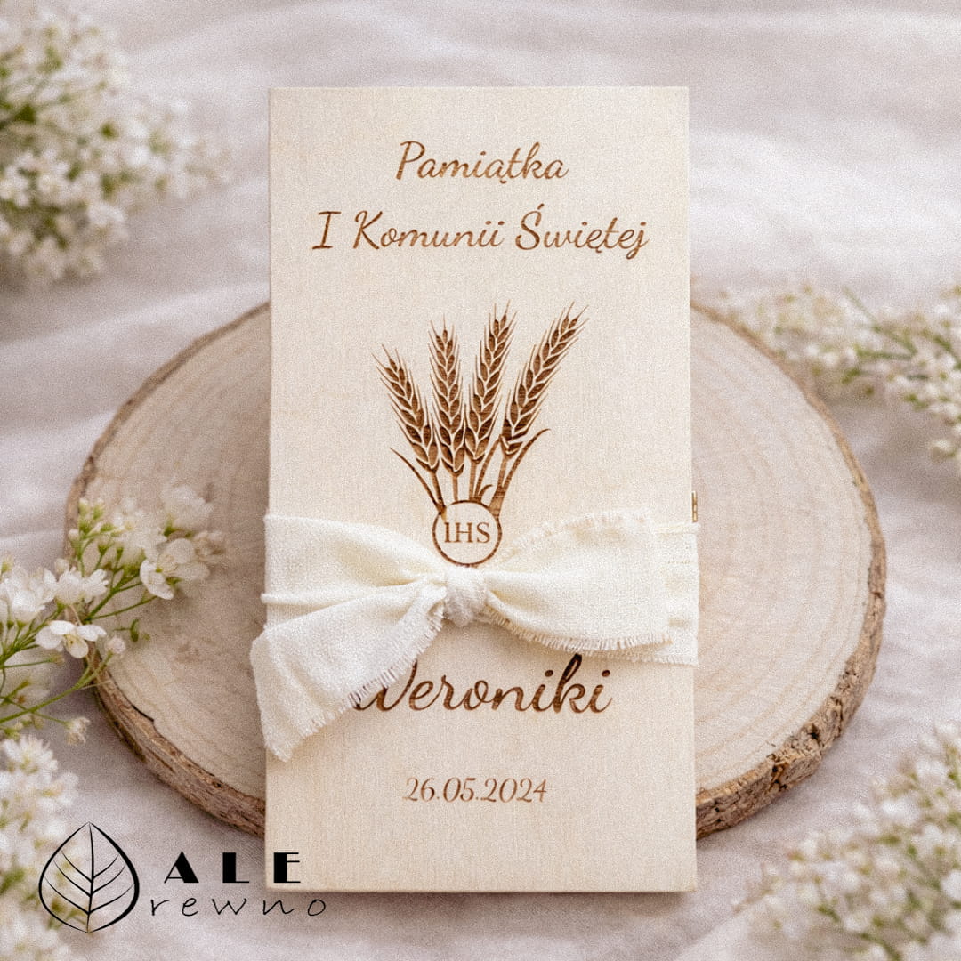 Drewniane pudełko prezent na Komunię Hostia to naturalny, symboliczny upominek wykonany z drewna, który zachwyca elegancją i zostaje pamiątką na lata.