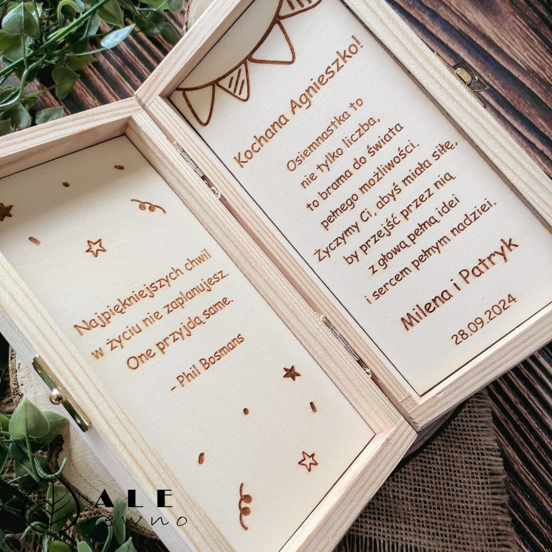 Niech Twój prezent wyróżni się na tle innych. Wybierając personalizowane drewniane pudełko, darujesz nie tylko gotówkę, ale przede wszystkim dowód pamięci i dbałości o szczegóły. Wpisz imię solenizanta, wybierz wiek oraz treść życzeń w zamówieniu, a my stworzymy dla Ciebie produkt, który stanie się najpiękniejszą pamiątką tego dnia!