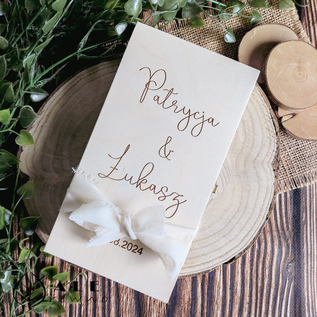 Drewniane pudełko na pieniądze ślubne z grawerem – stylowy sposób na wręczenie gotówki. Wyjątkowa pamiątka z życzeniami, która zachwyci każdą Parę Młodą.