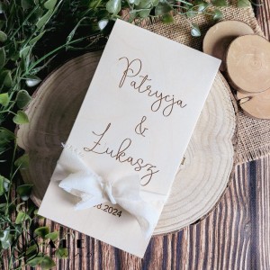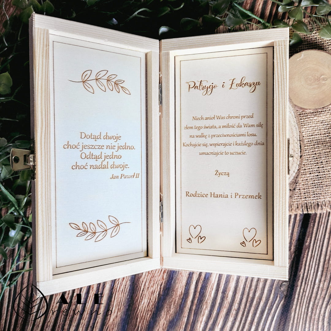 Niech Twój upominek będzie tak wyjątkowy, jak dzień ślubu Twoich bliskich. Wybierając personalizowane drewniane pudełko, stawiasz na polskie rzemiosło i ponadczasowy design. Wpisz imiona Pary Młodej oraz treść życzeń w zamówieniu, a my przygotujemy dla Ciebie produkt, który stanie się jedną z najpiękniejszych pamiątek ich wielkiego dnia!