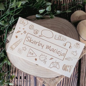 Dzieciństwo to czas zbierania niezwykłych pamiątek i pierwszych samodzielnych oszczędności. Nasze drewniane pudełko na skarby i pieniądze dziecka to idealne miejsce, by bezpiecznie przechowywać te małe-wielkie przedmioty. Wykonane z jasnego, naturalnego drewna, ozdobione radosnymi grawerami nawiązującymi do świata zabawy, gier i sportu, staje się osobistym królestwem każdego malucha. Dzięki personalizacji imieniem (np. "Skarby Macieja"), pudełko nabiera wyjątkowego charakteru i sprawia, że dziecko czuje się naprawdę wyróżnione.
