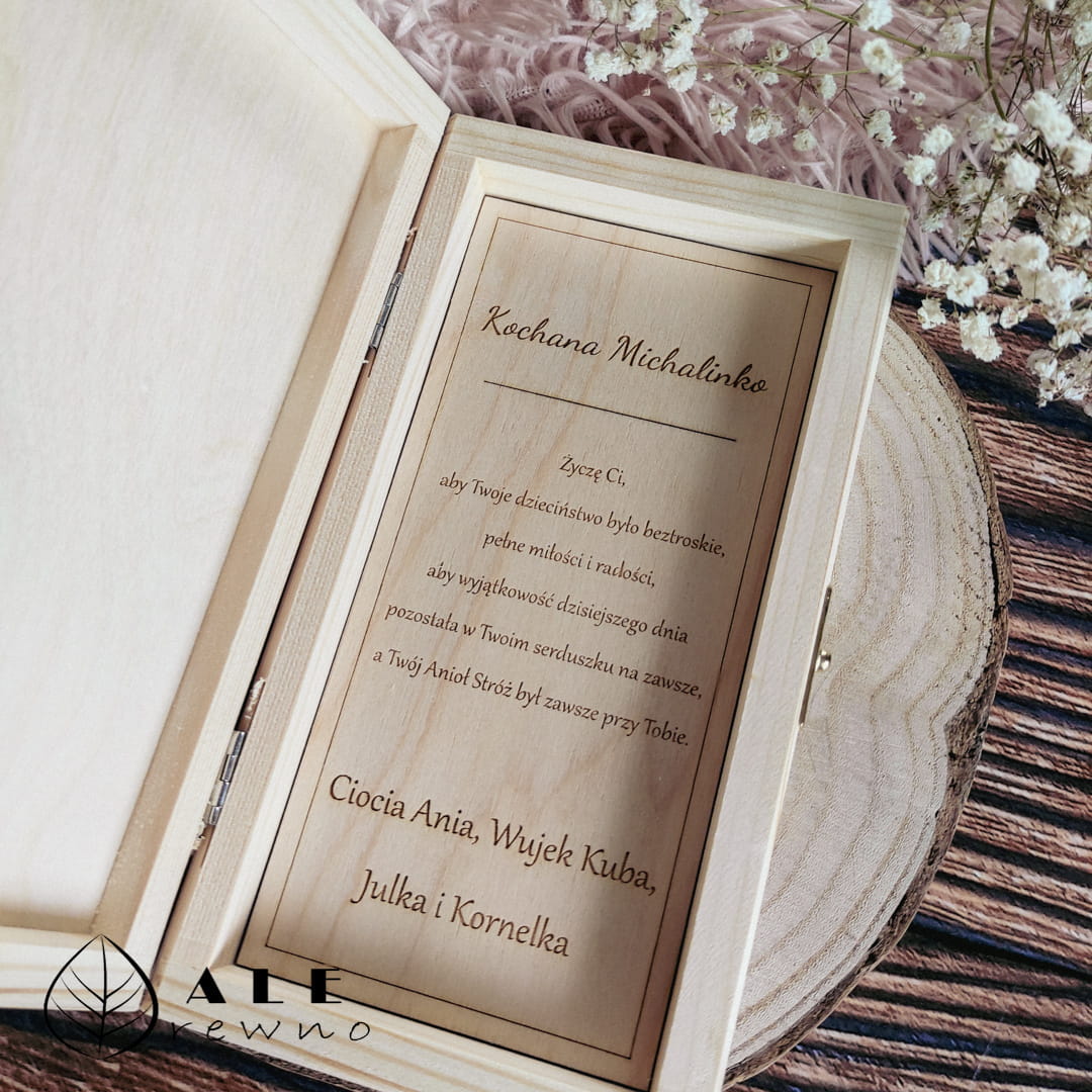 Drewniane pudełko na Chrzest z precyzyjnym grawerem gołębia (symbol Ducha Świętego) to wyjątkowa, ręcznie wykonana pamiątka z naturalnego drewna, która łączy duchowy charakter z ponadczasową estetyką. Personalizowany grawer na wieczku (imię i data) czyni je niepowtarzalnym prezentem na Chrzest Święty.