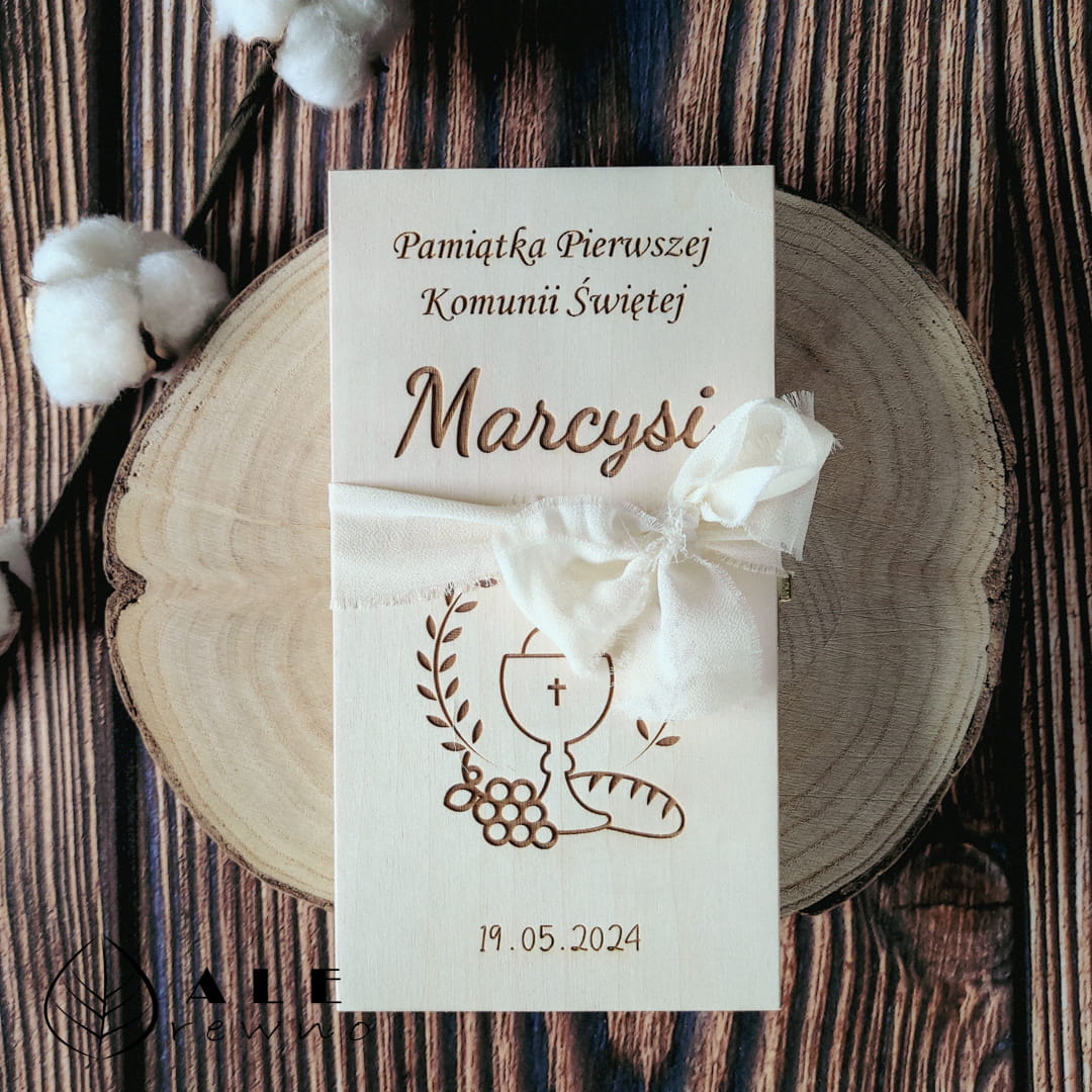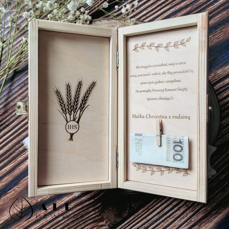 Drewniane pudełko na pieniądze z grawerem Hostii to naturalna i elegancka pamiątka Komunii Świętej, idealna do wręczenia pieniędzy w wyjątkowej, symbolicznej formie.