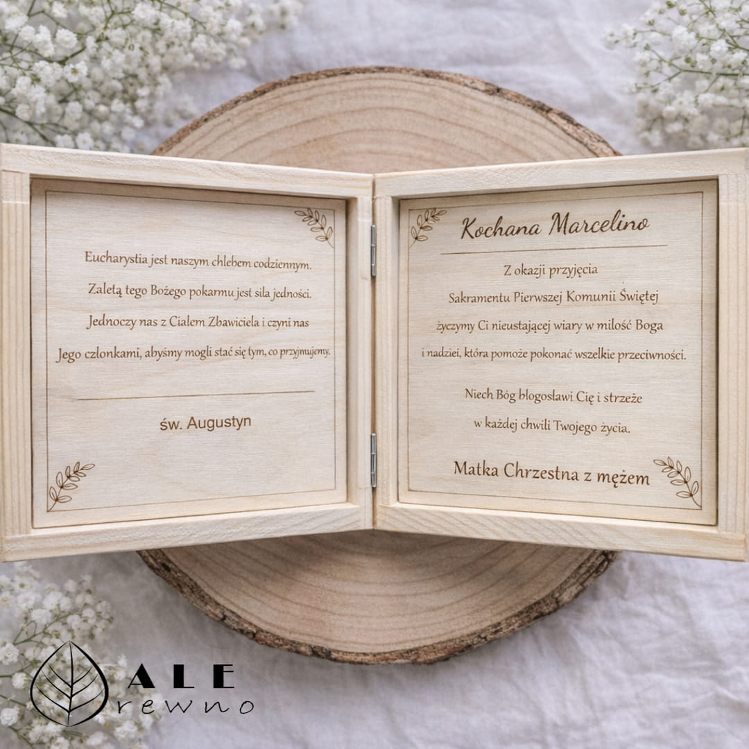 Drewniane pudełko na Komunię z życzeniami