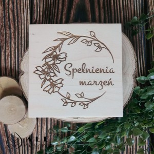 Zewnętrzna strona pudełka przykuwa wzrok artystycznym motywem kwiatowego wieńca oraz inspirującym hasłem „Spełnienia marzeń”. Prawdziwe wzruszenie następuje jednak po otwarciu – wewnątrz znajduje się w pełni personalizowana dedykacja, dopasowana do wieku i imienia bliskiej Ci osoby.