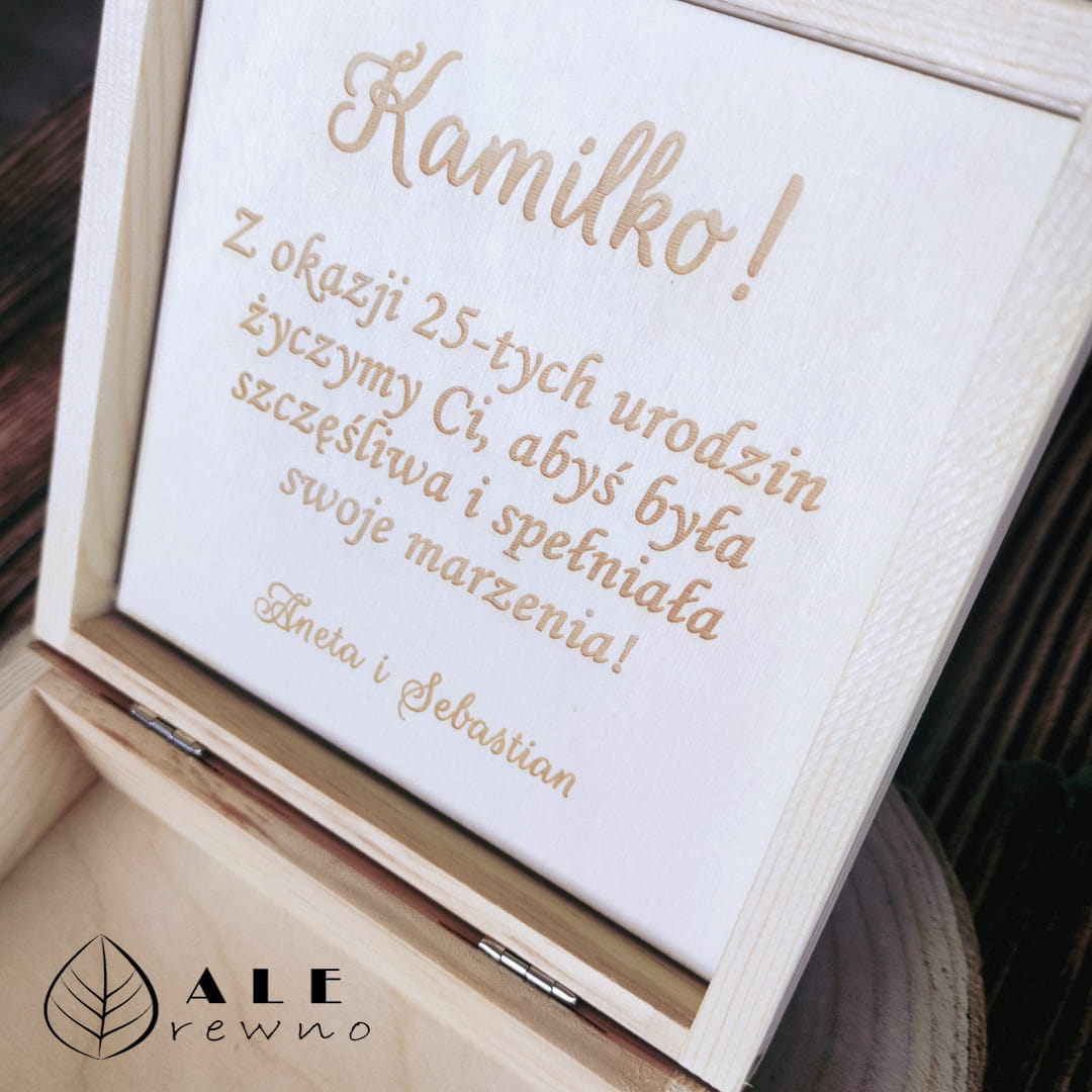Niech tegoroczne życzenia urodzinowe zyskają formę, na jaką zasługują. Nasze drewniane pudełko to gwarancja uśmiechu i wzruszenia u obdarowanej osoby. Wpisz imię solenizanta, wiek oraz treść życzeń w zamówieniu, a my przygotujemy dla Ciebie pamiątkę, która stanie się skarbnicą najpiękniejszych wspomnień!