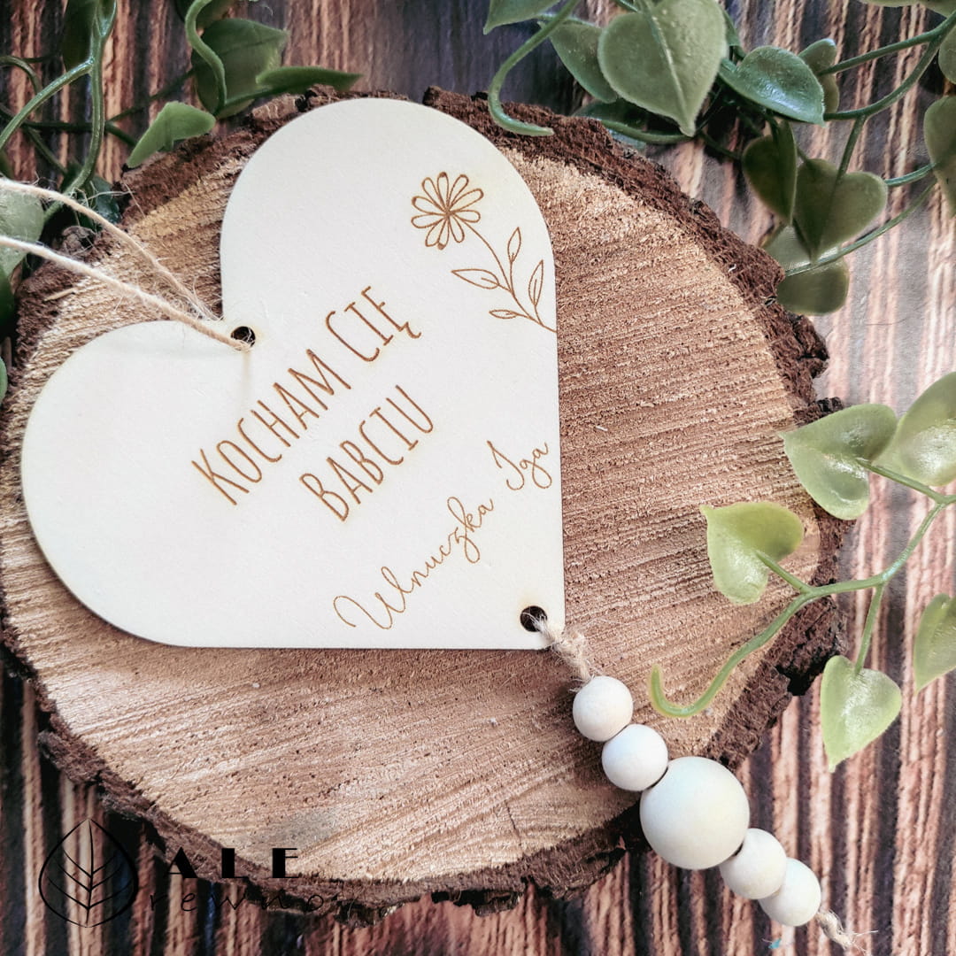 Zawieszka drewniana w kształcie serca o wymiarach 9,5x8,5 cm wykonana z drewna brzozowego naturalnego to doskonały wybór na prezent na Dzień Babci i Dziadka. Zdobiona pięknym grawerem z motywem kwiatowym i delikatnymi koralikami, z pewnością stanie się wyjątkową pamiątką, która doda uroku każdemu wnętrzu. Jej naturalny wygląd i elegancka forma sprawiają, że jest to idealny upominek na każdą okazję.