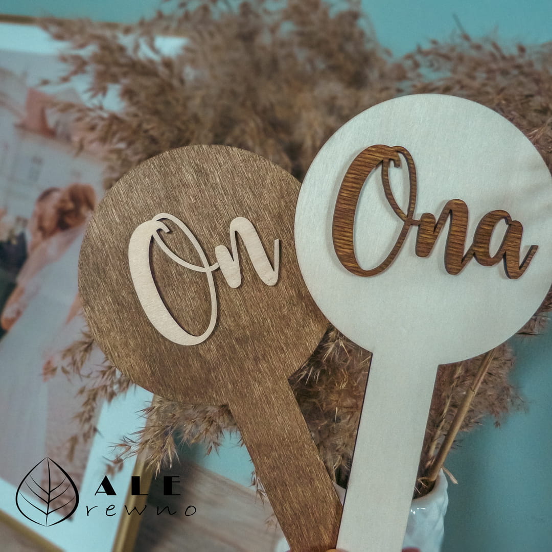 - Efekt 3D: Napisy „On” oraz „Ona” są naklejane, co tworzy elegancką głębię i sprawia, że są bardzo wyraźne na zdjęciach oraz filmach z wesela.
