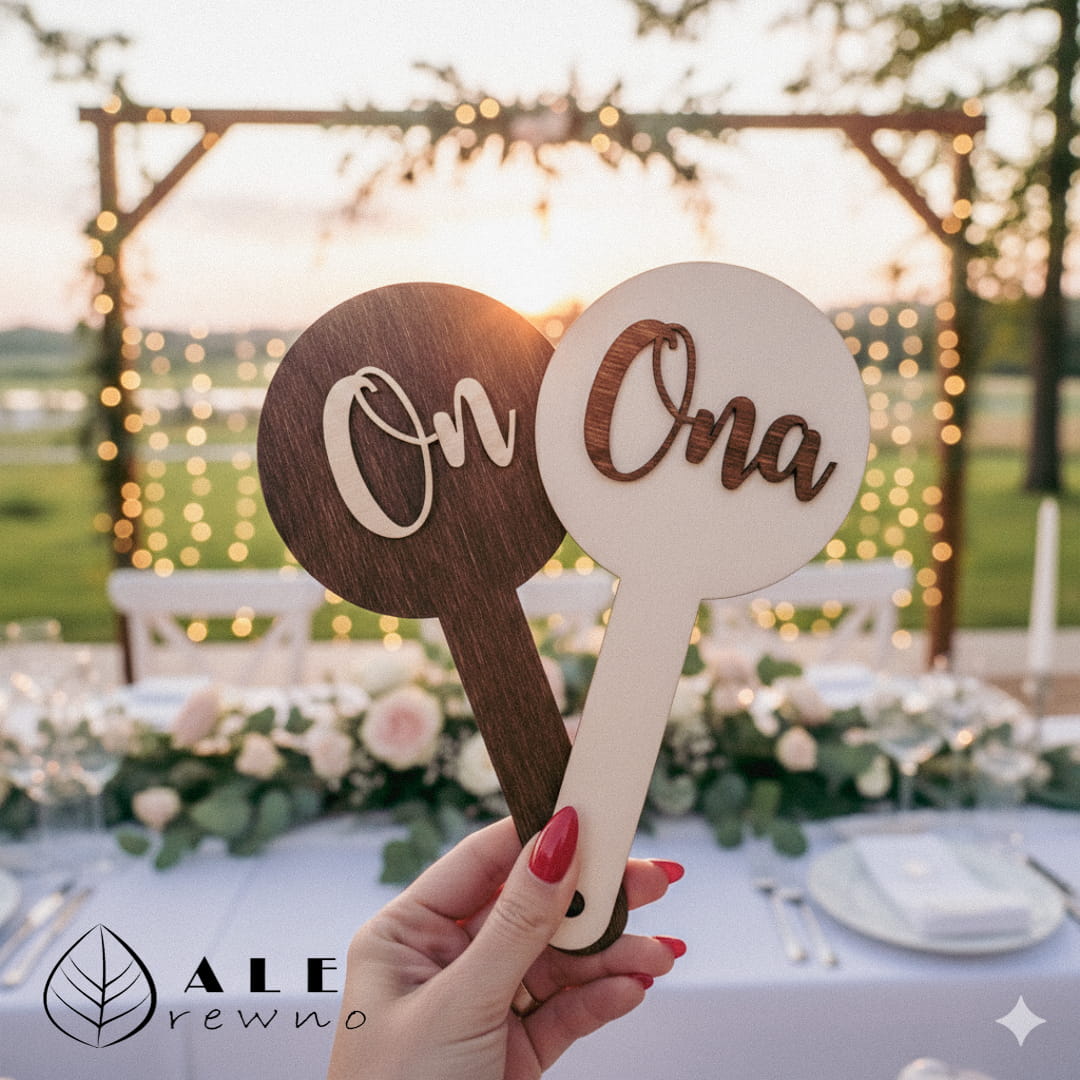 Tabliczki na oczepiny to kluczowy element popularnego „testu zgodności małżeńskiej”. Nasz zestaw został zaprojektowany tak, aby był nie tylko czytelny, ale i niezwykle fotogeniczny. Dzięki zastosowaniu dwóch kolorów tabliczek w teście zgodności małżeńskiej podczas uroczystości weselnej goście weselni lepiej dostrzegą różnicę zdań Pary Młodej, co gwarantuje salwy śmiechu i świetną zabawę. Kontrastowe barwy (naturalne jasne drewno oraz elegancki ciemniejszy brąz) sprawiają, że nawet z końca sali widać, czy Młodzi odpowiadają tak samo, czy wręcz przeciwnie!