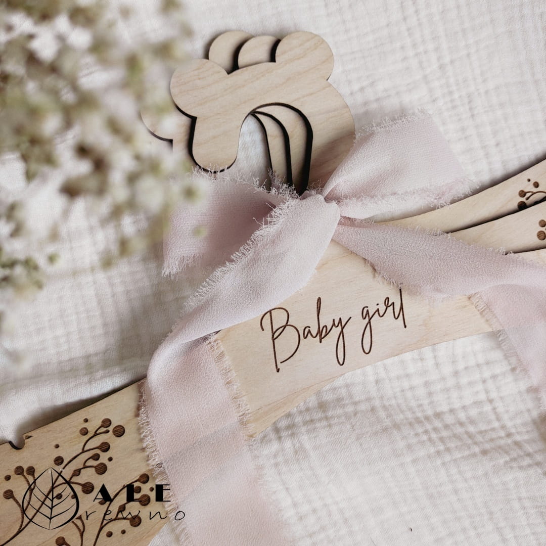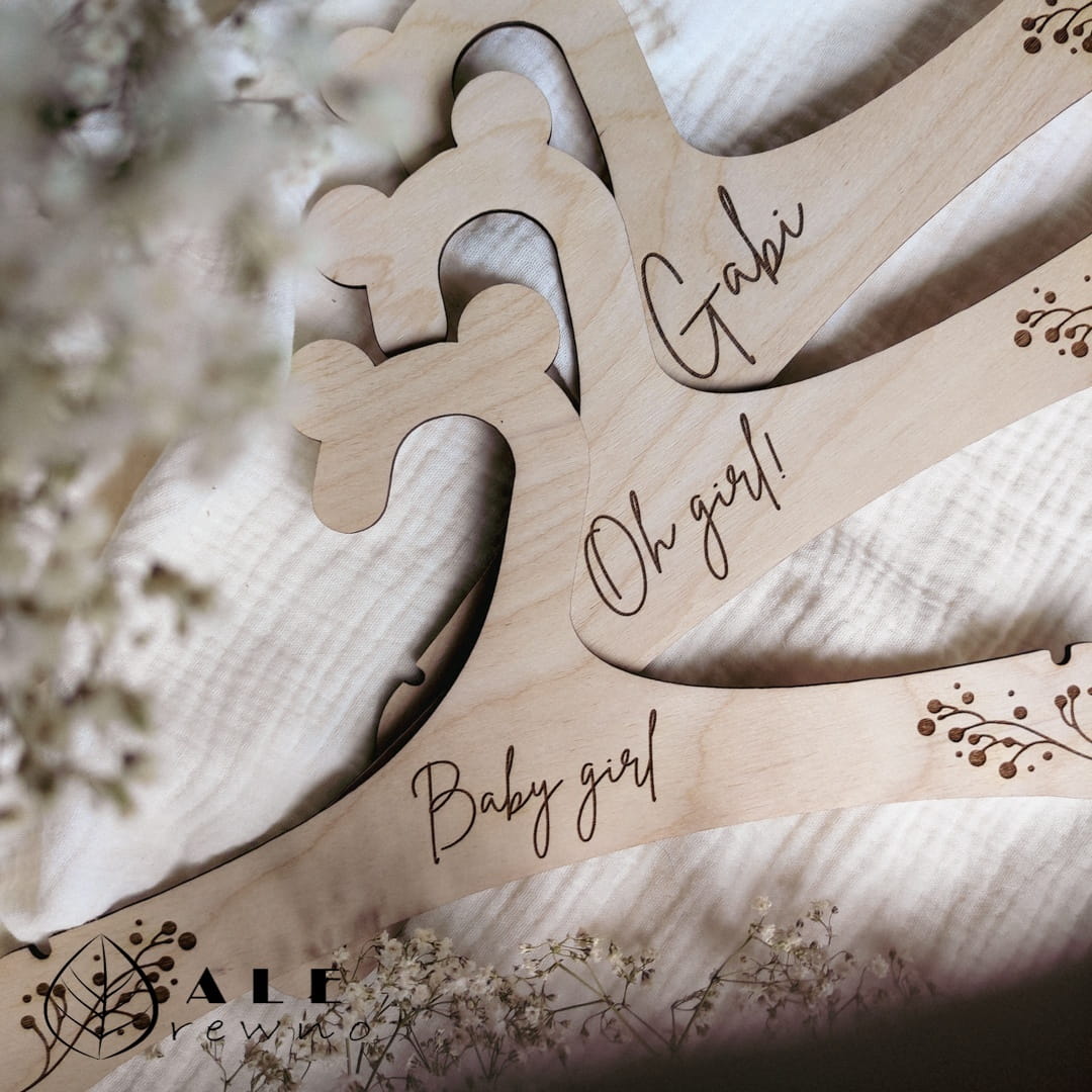 Nasze drewniane wieszaki na ubrania dla dziewczynki to połączenie praktyczności z subtelną dekoracją. Wykonane z naturalnego drewna brzozowego, lekkie, a zarazem trwałe. Dzięki delikatnemu grawerowi z imieniem i uroczym napisem ("Baby girl", "Oh girl!") i pudrowo-różowej wstążce, każdy wieszak staje się wyjątkową ozdobą dziecięcej przestrzeni. Zestaw zawiera 3 sztuki wieszaków.