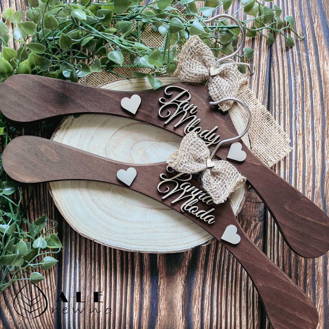 Drewniane wieszaki ślubne w głębokim brązowym kolorze z personalizacją. Podkreśl wyjątkowość Twojej kreacji i zadbaj o detale podczas ślubnych przygotowań.