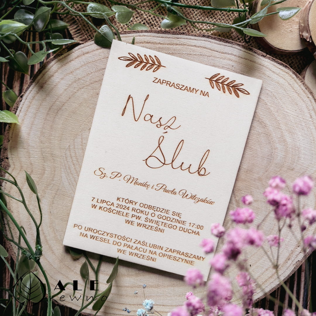 Drewniane zaproszenie na ślub z grawerem to elegancka i trwała forma zaproszenia, która zachwyca naturalnym stylem i personalnym charakterem.