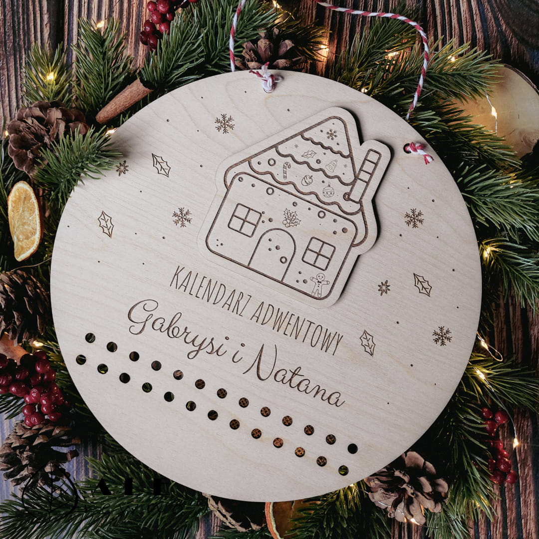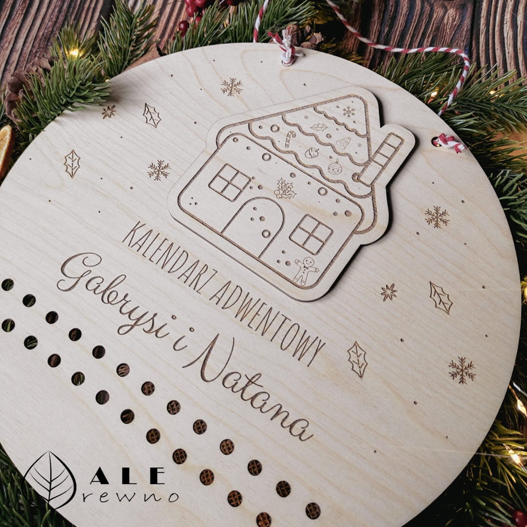 Drewniany kalendarz adwentowy z imieniem dziecka domek