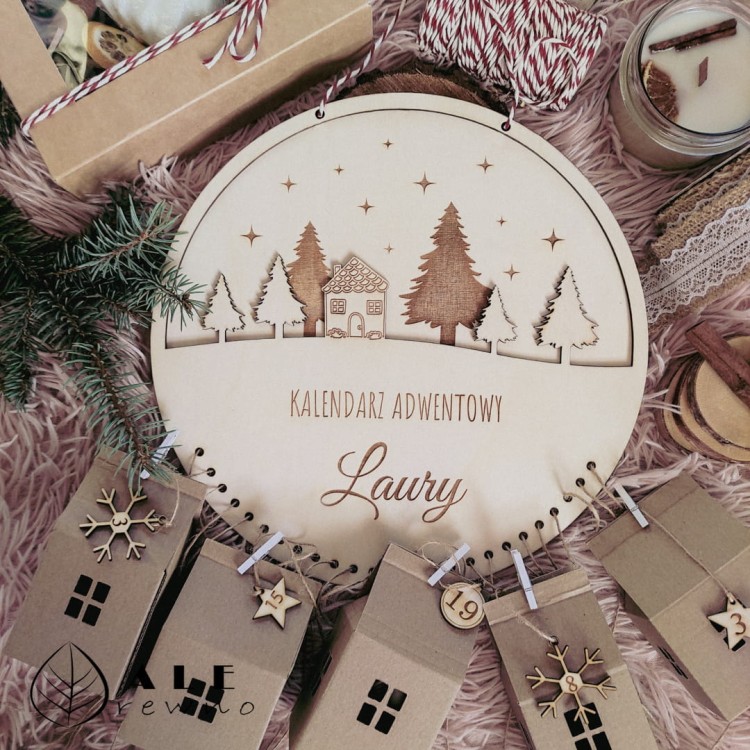 Drewniany kalendarz adwentowy dla dzieci to wyjątkowa dekoracja świąteczna o średnicy 28 cm i grubości 6 mm, wykonana z naturalnego drewna topolowego. Dzięki przestrzennej formie 3D i precyzyjnemu wycięciu, pięknie ozdobi półkę, komodę lub parapet, nie zajmując dużo miejsca. Każde z 24 okienek pomieści słodycze, drobne prezenty lub świąteczne niespodzianki, tworząc magiczny rytuał odliczania dni do Bożego Narodzenia.