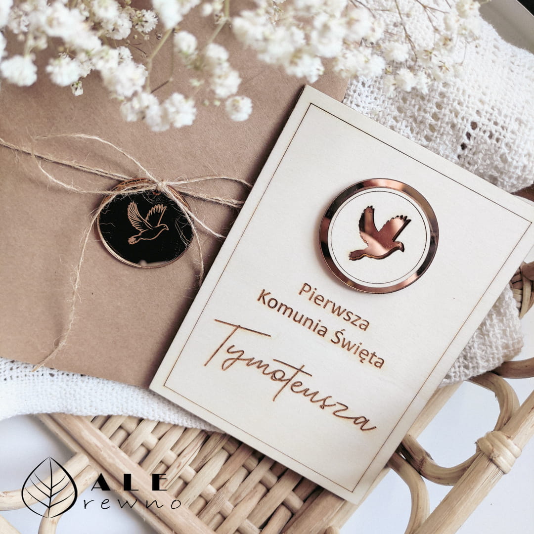 Pierwsza Komunia Święta to moment, do którego wraca się we wspomnieniach przez całe życie. Wybierając naszą personalizowaną drewnianą kartkę, zyskujesz pewność, że Twoje słowa zostaną utrwalone w najpiękniejszy możliwy sposób. Podaj imię dziecka, datę oraz treść życzeń w zamówieniu, a my przygotujemy dla Ciebie pamiątkę, która stanie się bezcennym świadectwem tego wyjątkowego dnia!