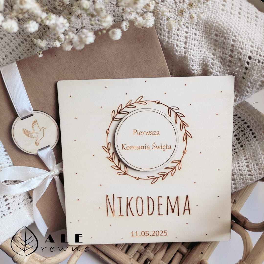 Kartka z życzeniami pamiątka na Komunię Świętą – drewniana personalizacja z imieniem. Elegancki grawer, motyw gołębicy i koperta ze stylową wstążką w zestawie.