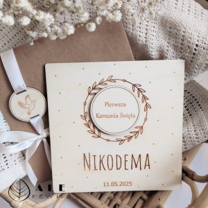 Pierwsza Komunia Święta to moment, który zasługuje na pamiątkę trwalszą niż zwykły papier. Nasza drewniana kartka z życzeniami na Komunię Świętą to połączenie szlachetnej prostoty z nowoczesną personalizacją. Wykonana z jasnego drewna brzozowego, ozdobiona subtelnym motywem wieńca oraz wypukłym detalem z napisem „Pierwsza Komunia Święta”, stanowi niezwykle gustowny sposób na przekazanie życzeń. Na froncie grawerujemy imię dziecka oraz datę uroczystości, co czyni ją unikatowym świadectwem tego ważnego dnia.