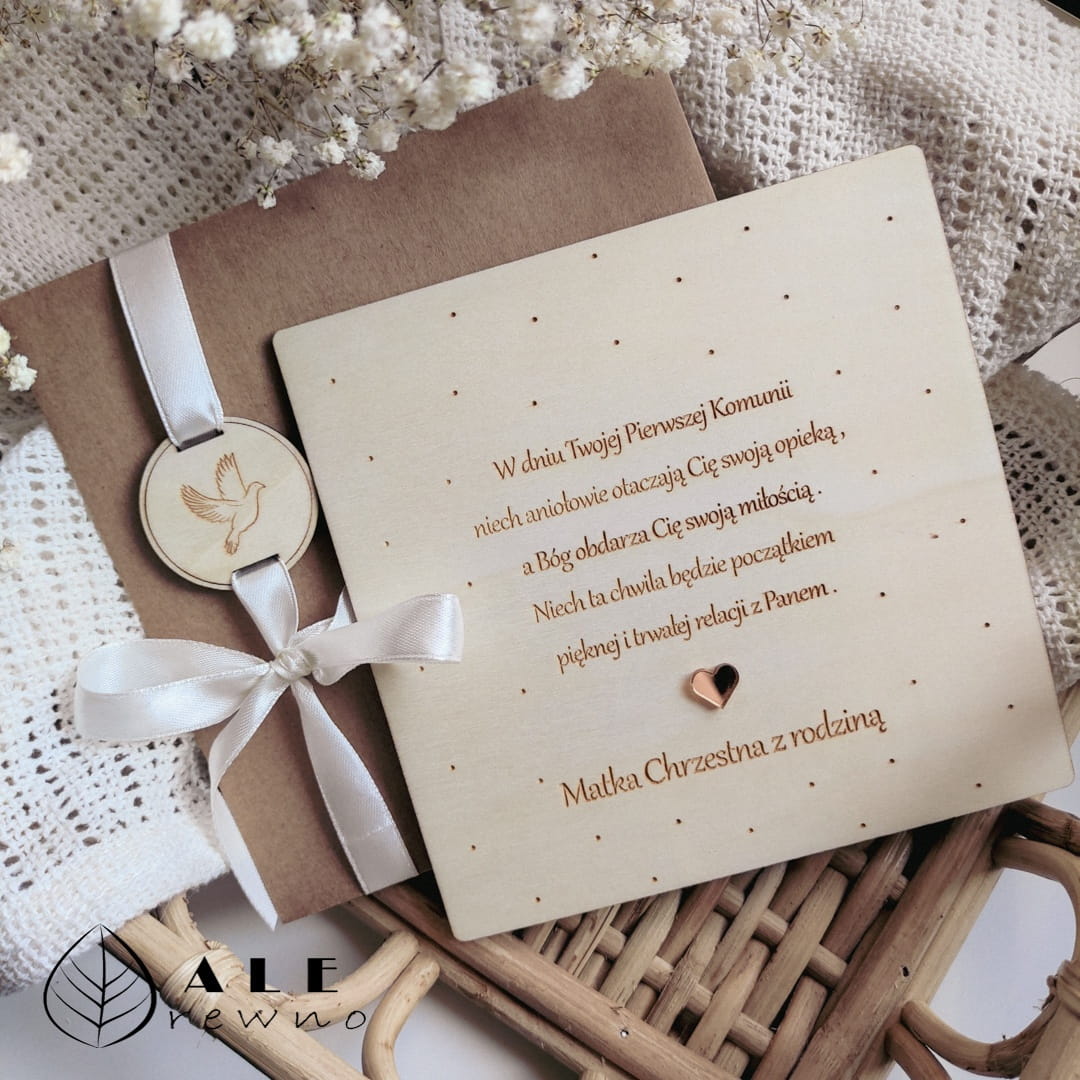Kartka z życzeniami pamiątka na Komunię Świętą – elegancja ukryta w drewnie