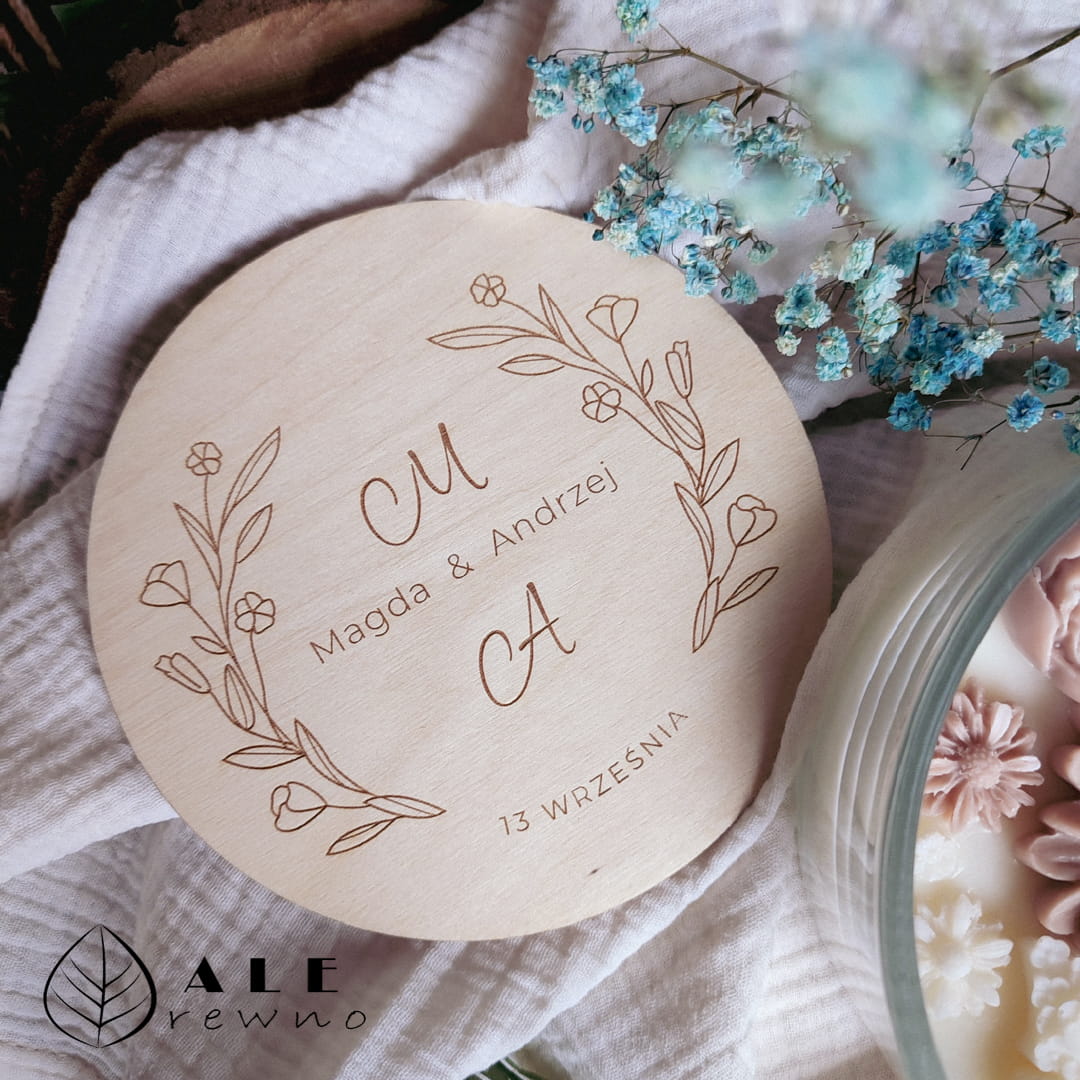 - drewniane wieczko z grawerem inicjałów Pary Młodej