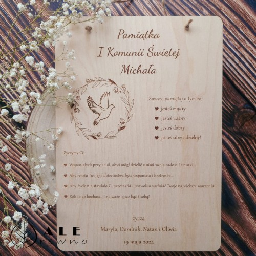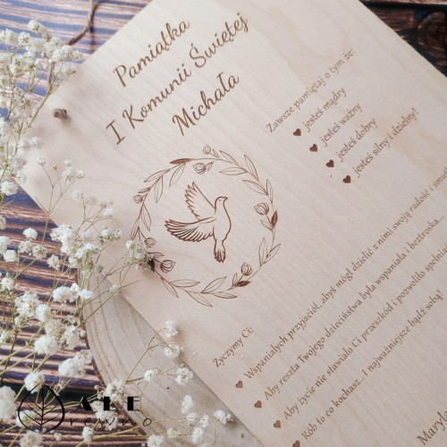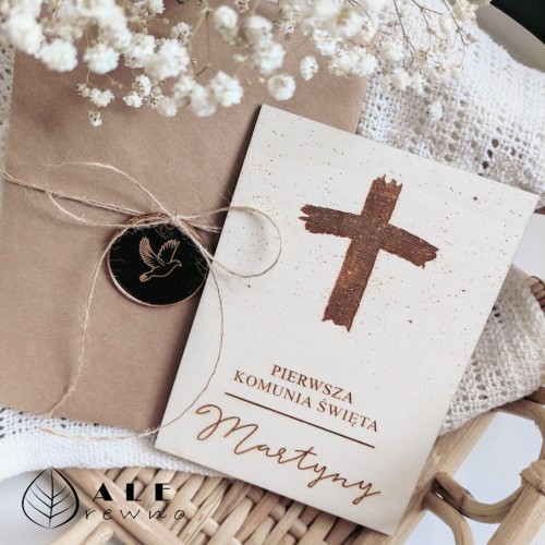 Nasze kartki komunijne wykonane są z naturalnego drewna i zdobione precyzyjnym grawerem. Możliwość personalizacji – imię dziecka, data uroczystości czy indywidualne życzenia – sprawia, że każda kartka nabiera osobistego charakteru. Doskonale sprawdzają się jako samodzielny upominek lub estetyczne uzupełnienie pudełka komunijnego czy prezentu pieniężnego.