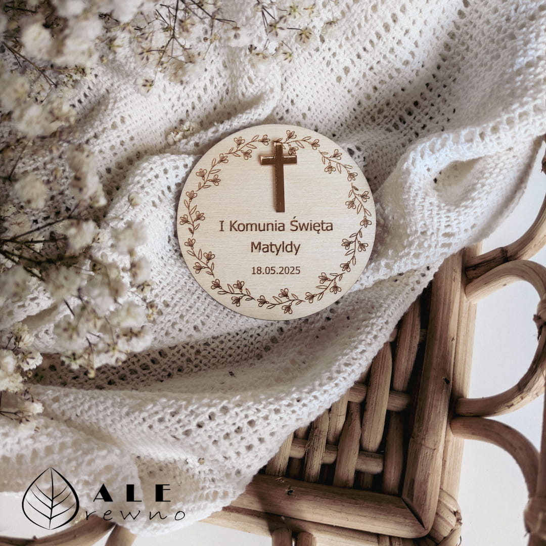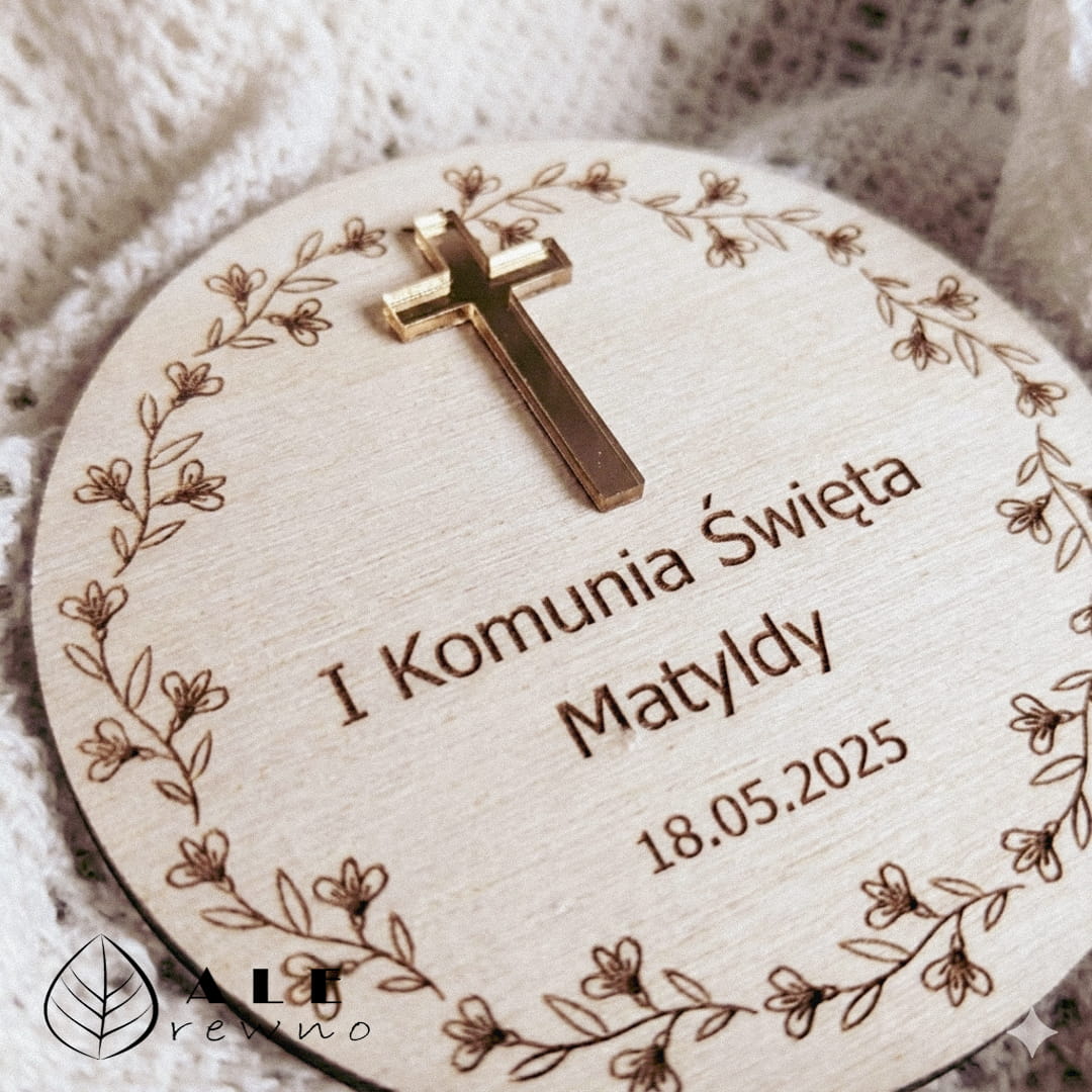 Pierwsza Komunia Święta to wyjątkowy dzień, który chcemy celebrować w gronie najbliższych osób. Nasze podziękowanie dla gości na Komunię magnes to subtelny, a zarazem niezwykle stylowy sposób, aby podziękować rodzinie i przyjaciołom za ich obecność w tak ważnym momencie życia dziecka. Wykonany z naturalnego drewna magnes wyróżnia się precyzyjnym grawerem delikatnego, kwiecistego wieńca, wewnątrz którego umieszczamy imię dziecka oraz datę sakramentu. Centralnym elementem ozdoby jest wypukły, lustrzany krzyżyk w kolorze złotym, który nadaje pamiątce blasku i podkreśla jej sakralny charakter.